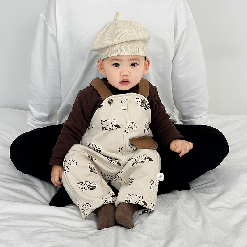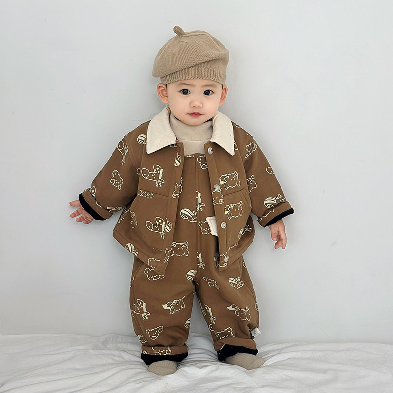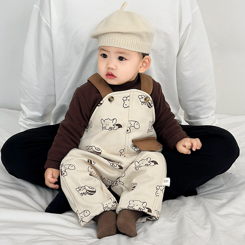 男童冬装卡通加绒外套洋气女宝宝加厚背带裤子婴儿保暖打底衫套装