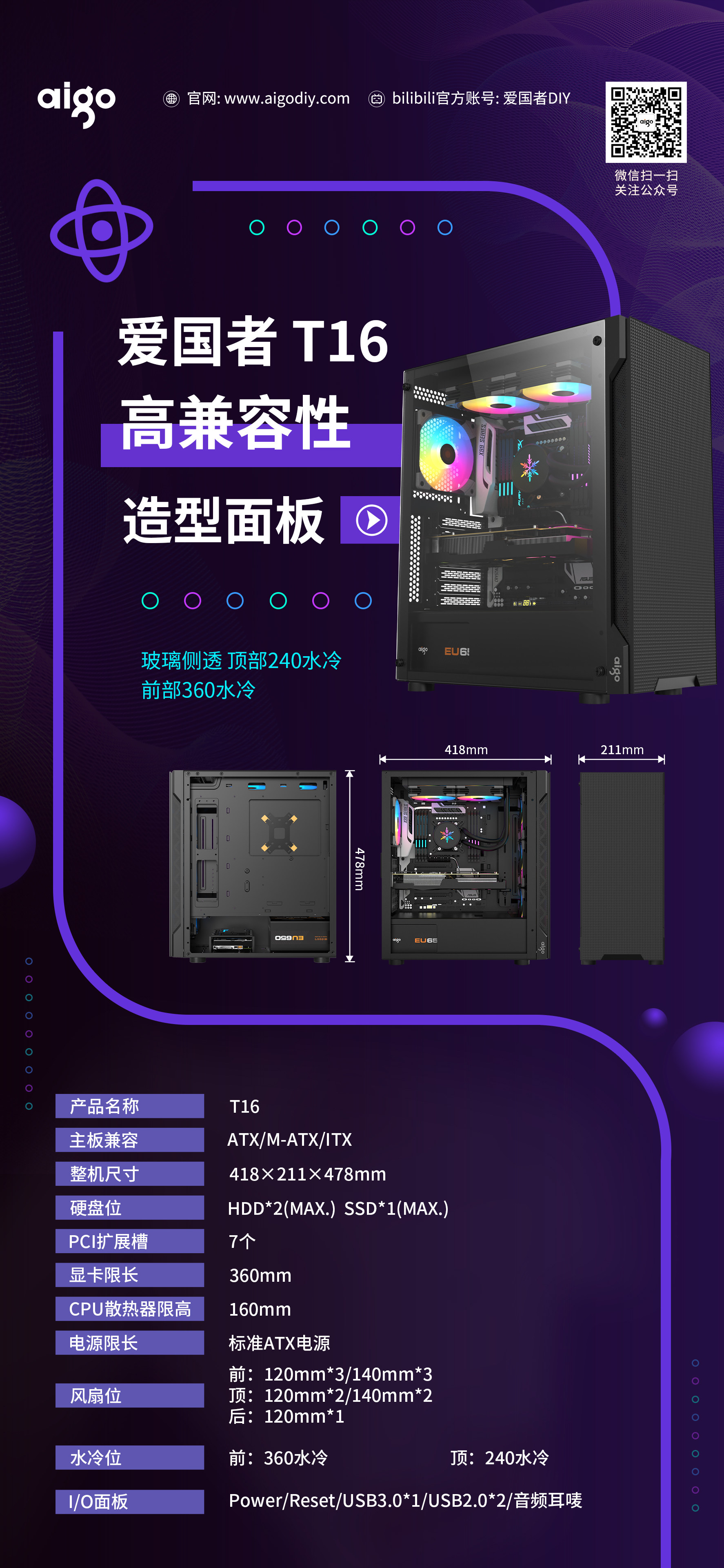 爱国者T16电脑机箱台式玻璃侧透家用办公游戏水冷ATX大板机箱背线
