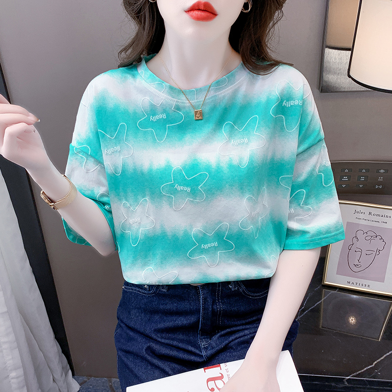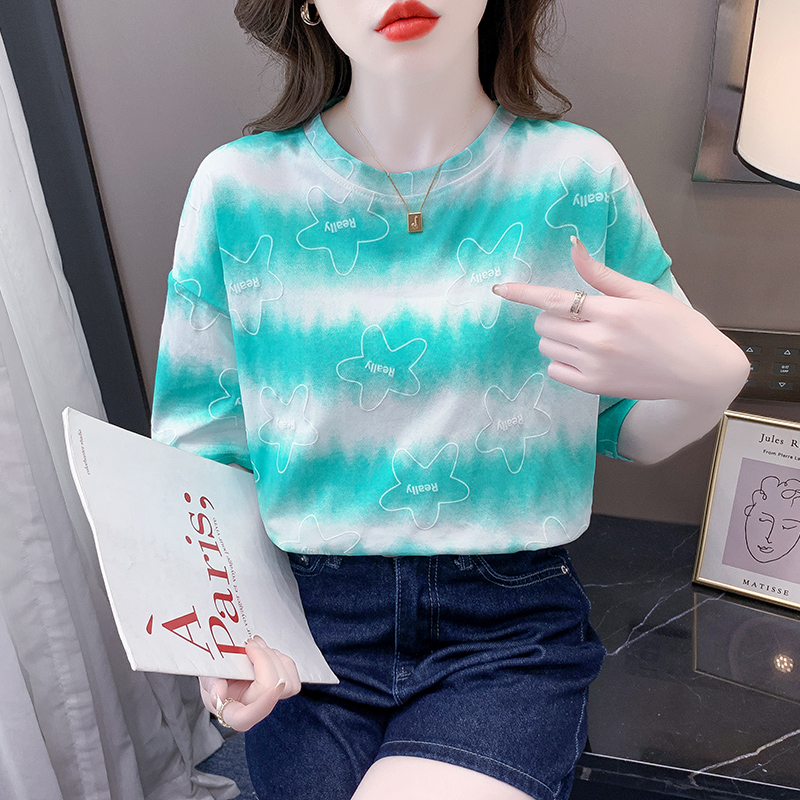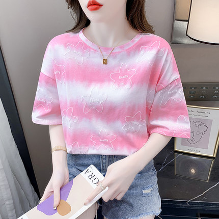 时尚扎染印花纯棉短袖T恤女2023夏季新款韩版宽松百搭圆领上衣服