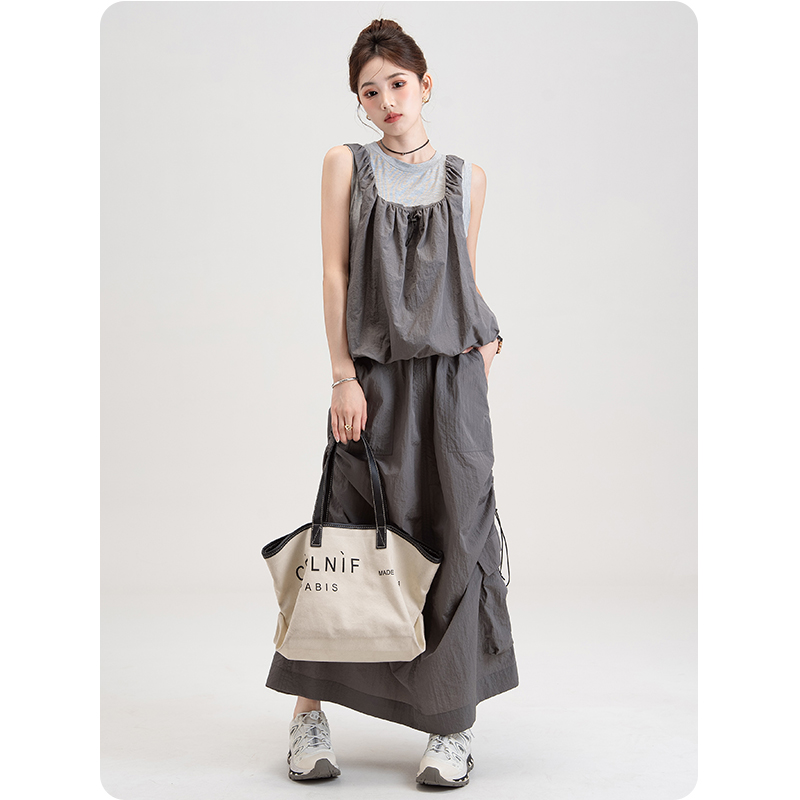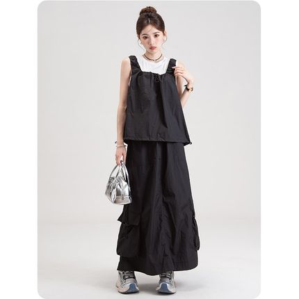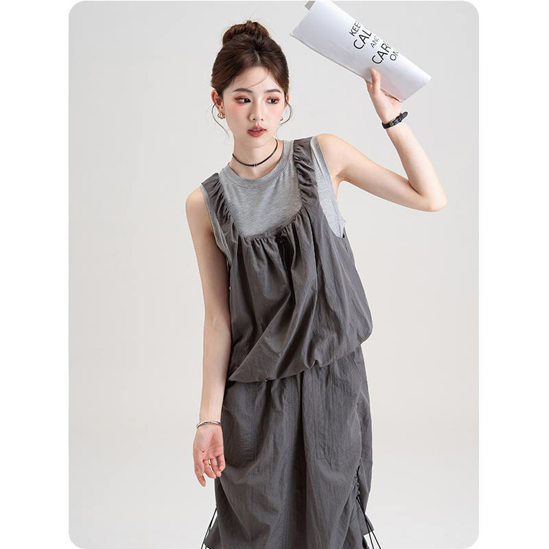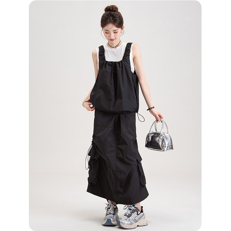 撞色连衣裙叠穿工装抽绳褶皱马甲2024新款女夏季酷飒拽姐两件套装