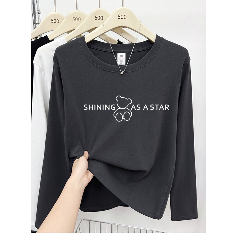 纯棉长袖T恤女正肩黄色小熊图案内搭打底衫宽松显瘦减龄圆领上衣