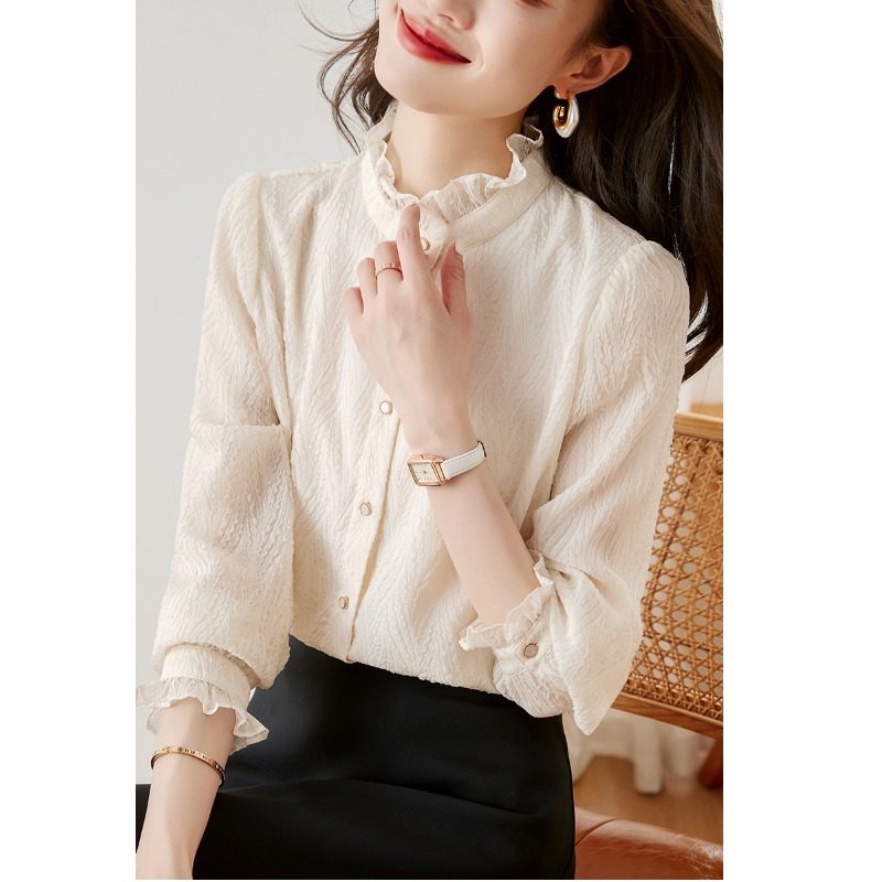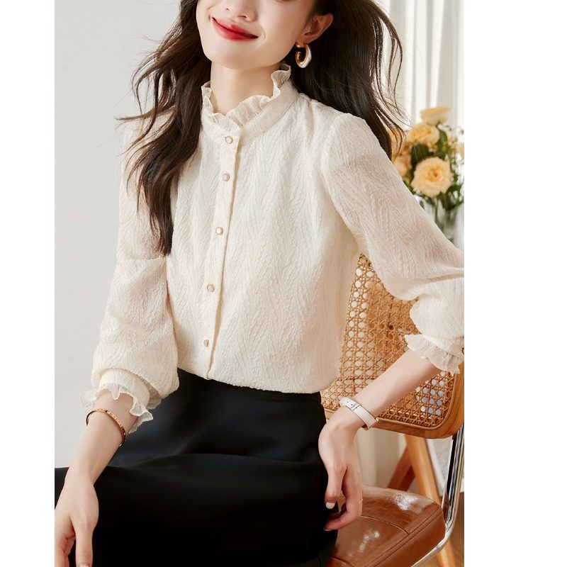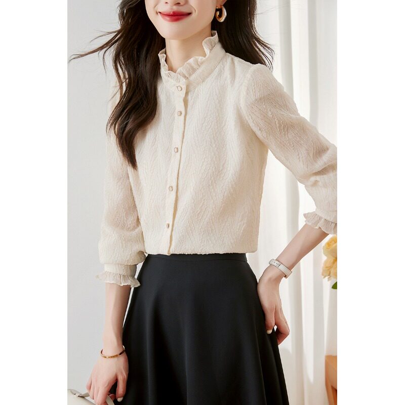雪纺衬衫女2025秋季新款洋气内搭木耳领蕾丝打底衫显瘦遮肚子上衣