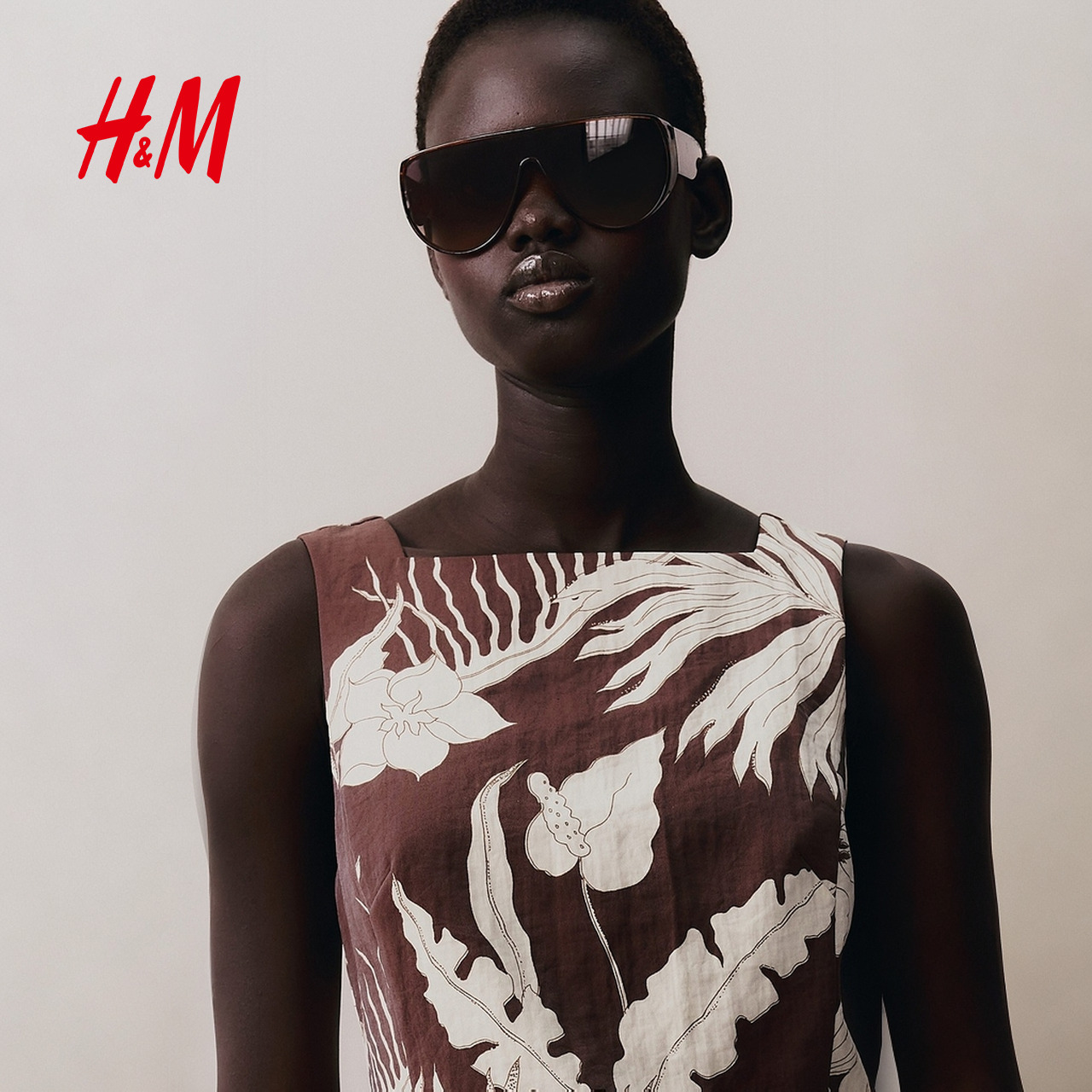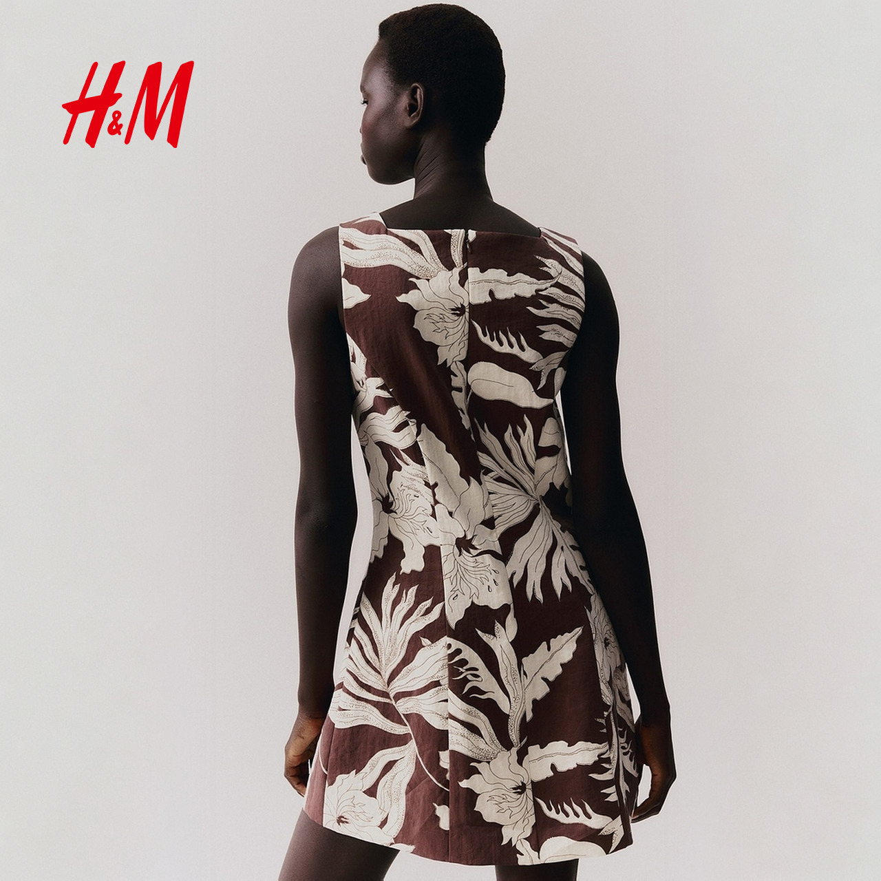 HM女装背心式连衣裙2025夏新款花卉印花斜纹布方领连身裙1289960