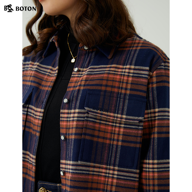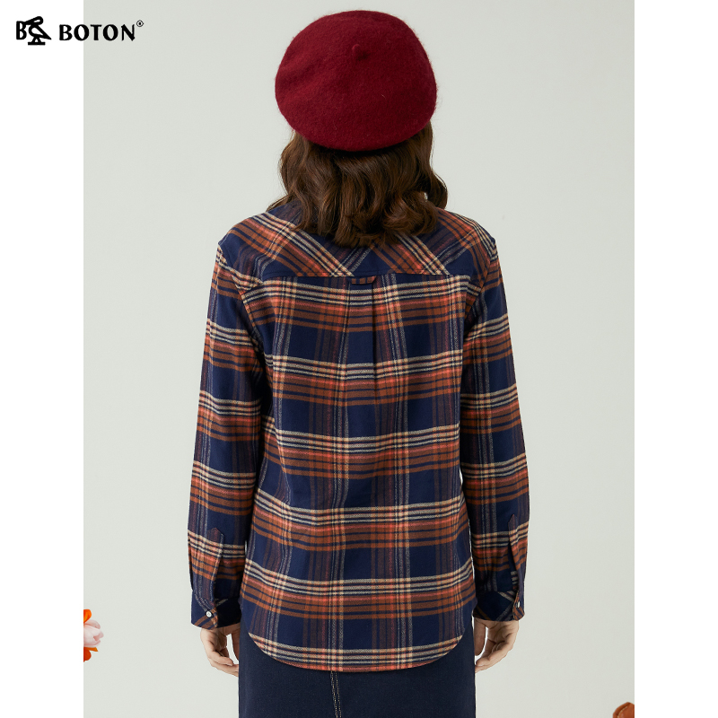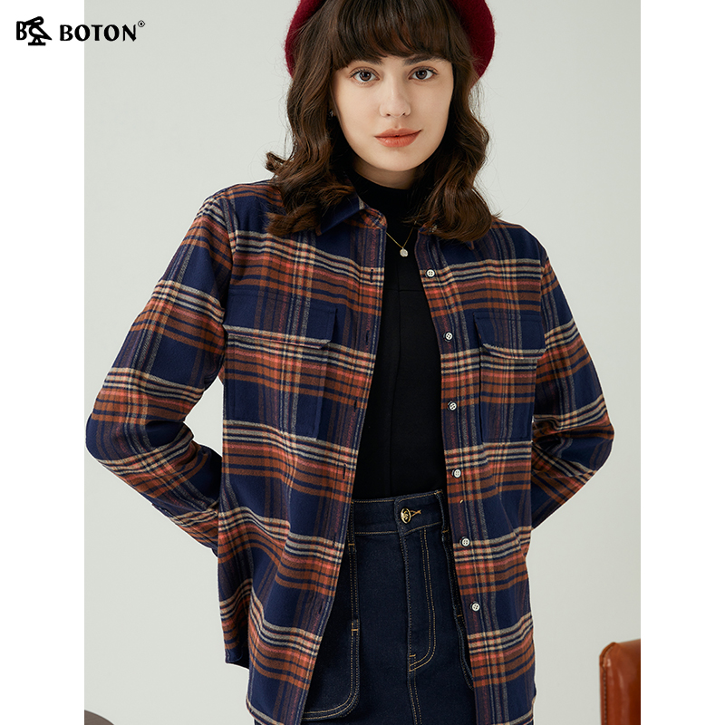 [长绒棉]波顿2025秋冬新款长袖女士藏蓝咖啡色格子衬衫高端英伦风