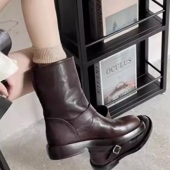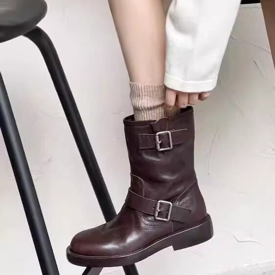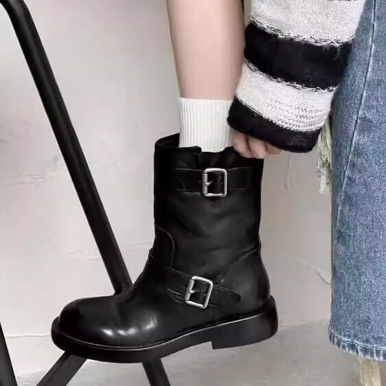 马丁靴女2025秋冬新款平底皮带扣机车靴子真皮英伦风中筒粗跟短靴
