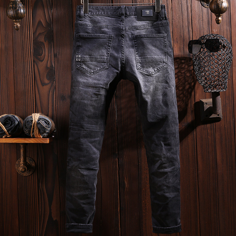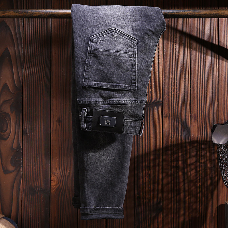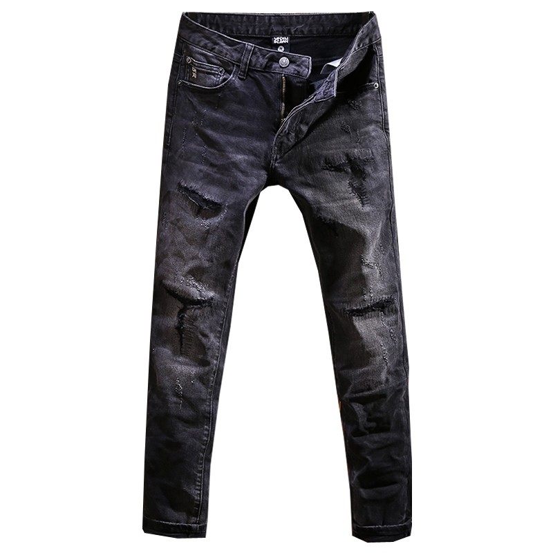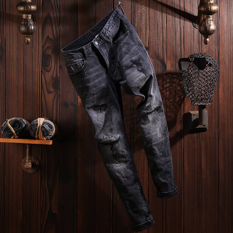 春秋潮牌男士黑色修身窄脚牛仔裤男破洞补丁个性青年九分小脚裤