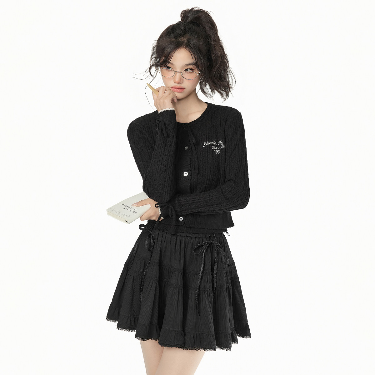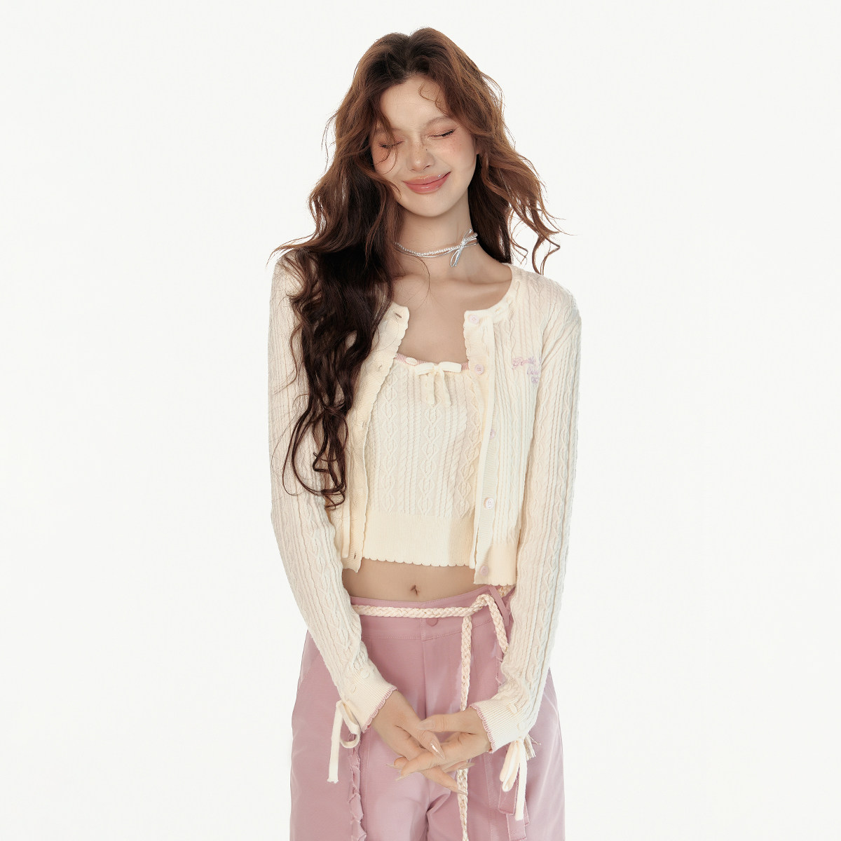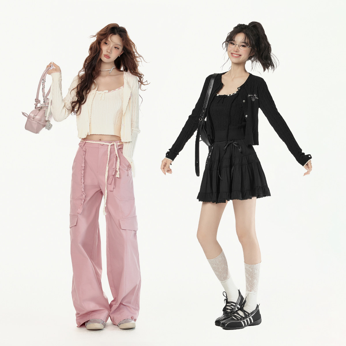 EPTISON套装女2025秋新款甜美撞色波浪边吊带背心针织开衫两件套