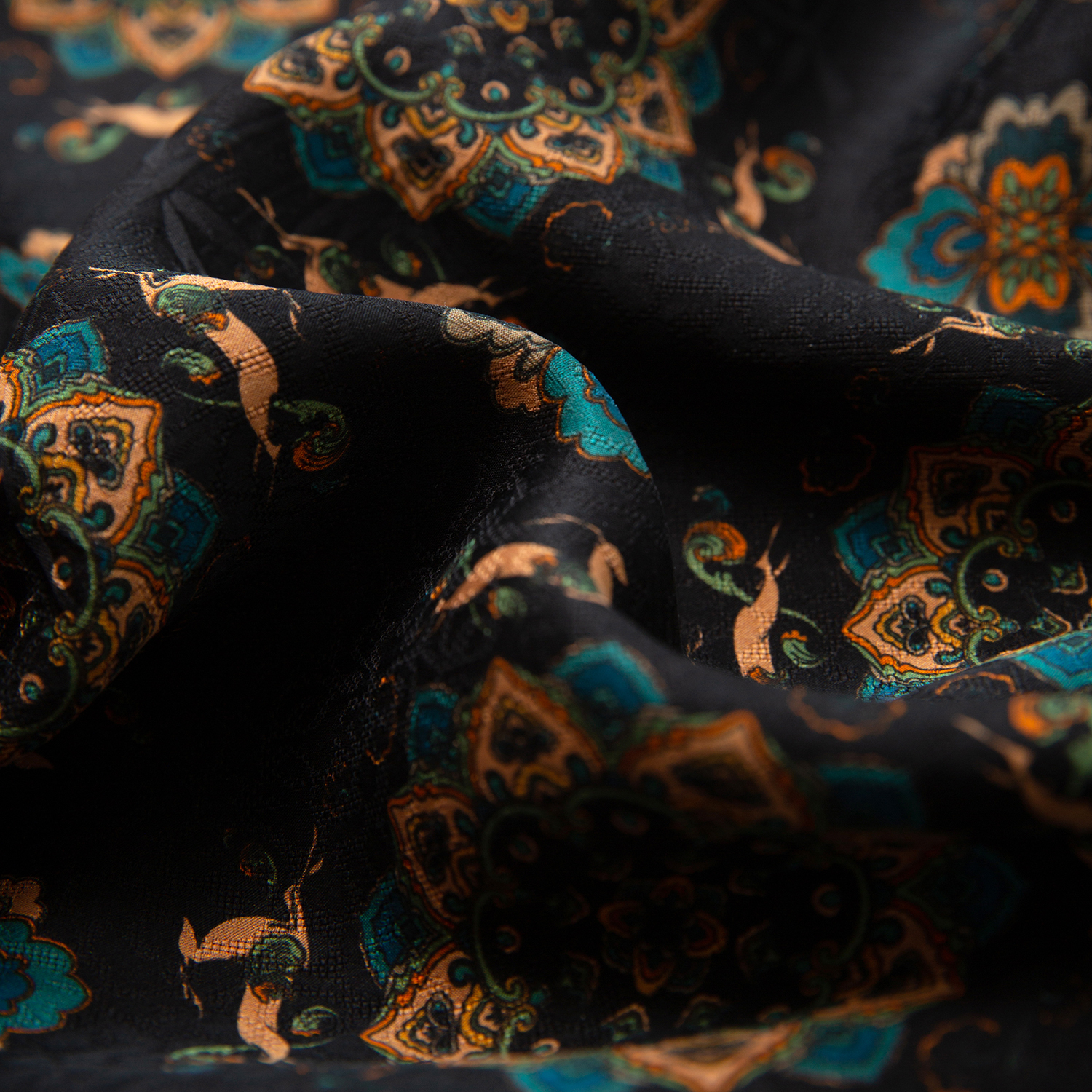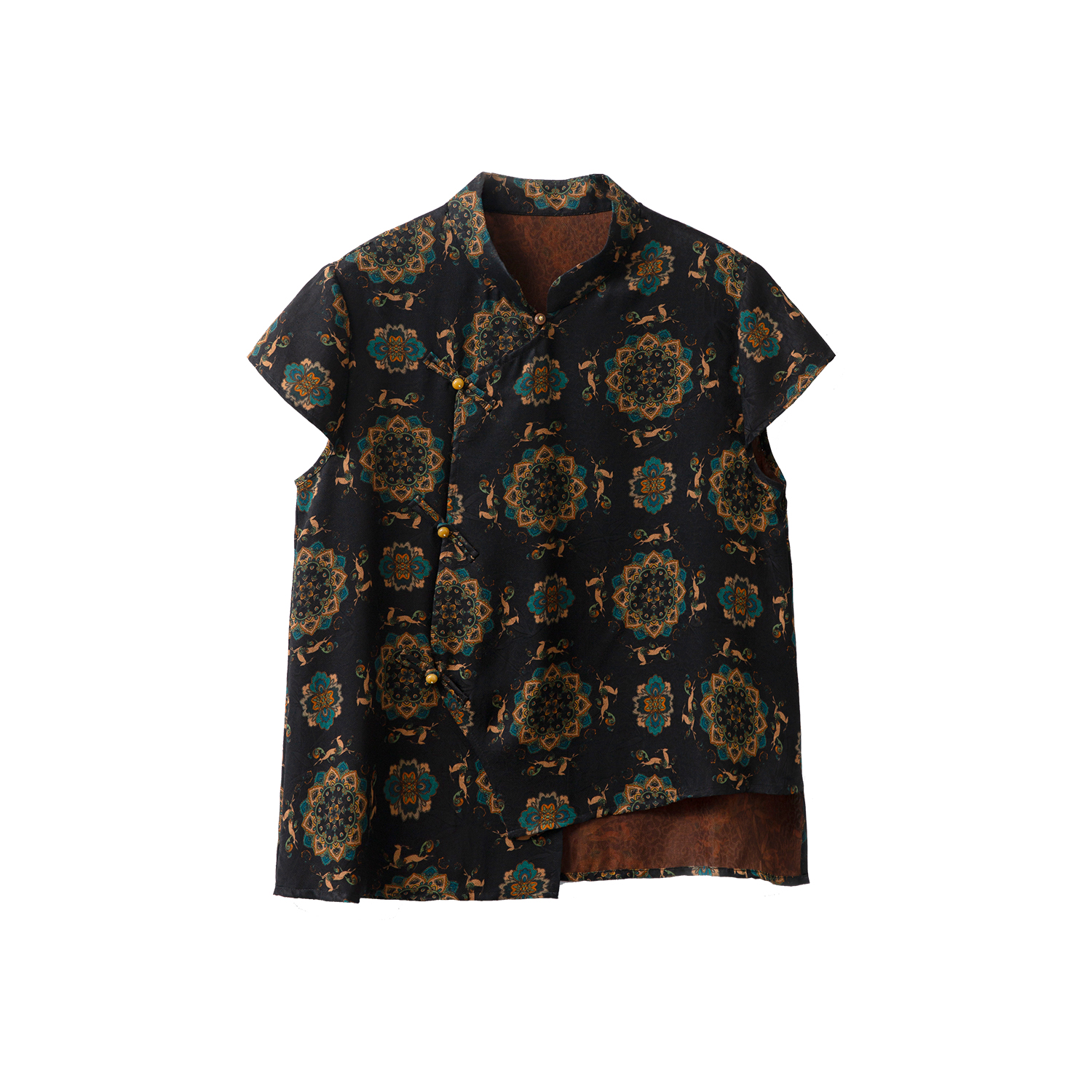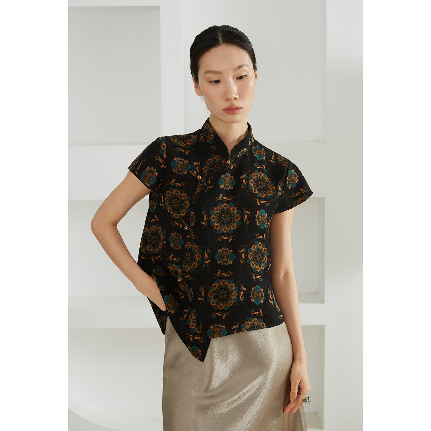 一丝牵香云纱花萝宝相花真丝立领短袖上衣女100%桑蚕丝国风斜门襟