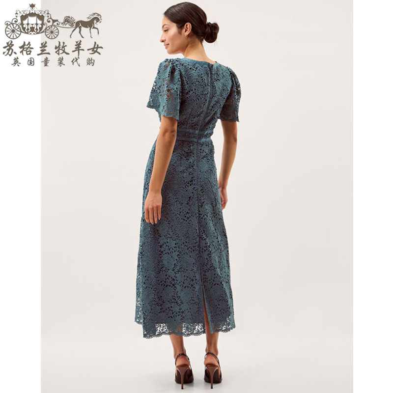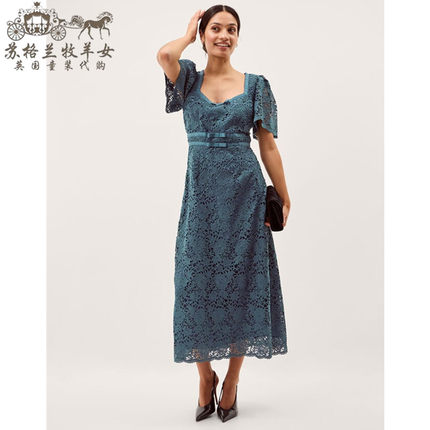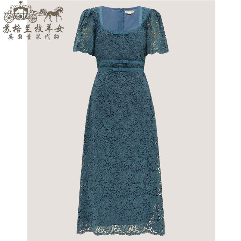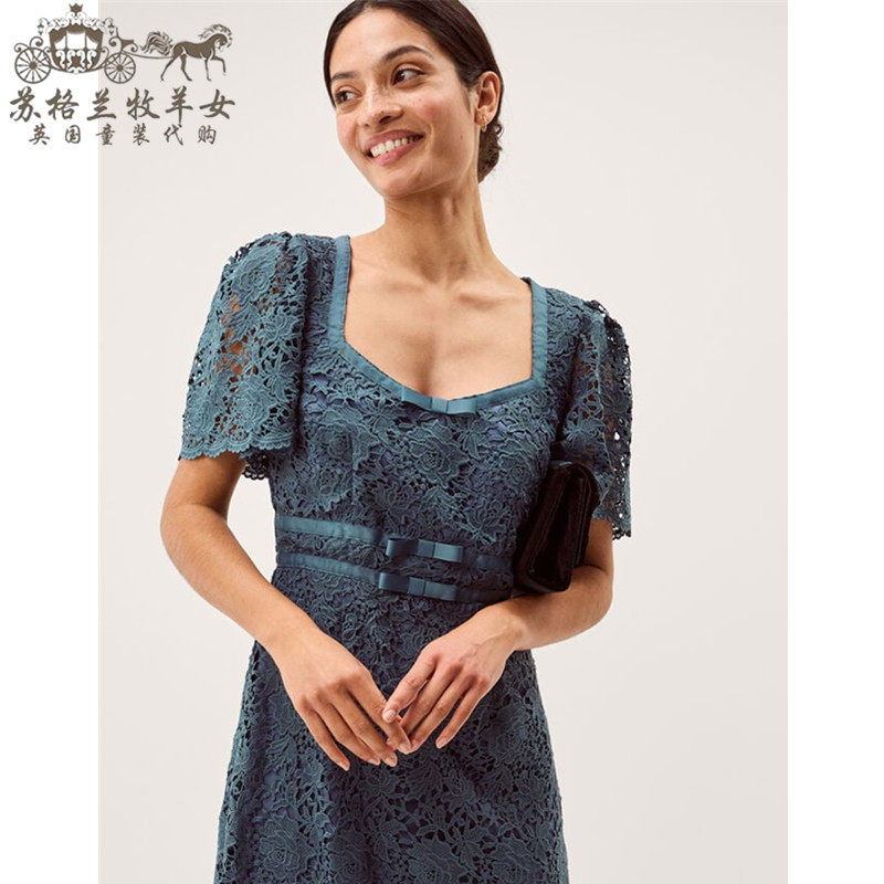英国Monsoon代购 女装26春新款 蓝色蕾丝短袖礼服中长裙连衣裙子