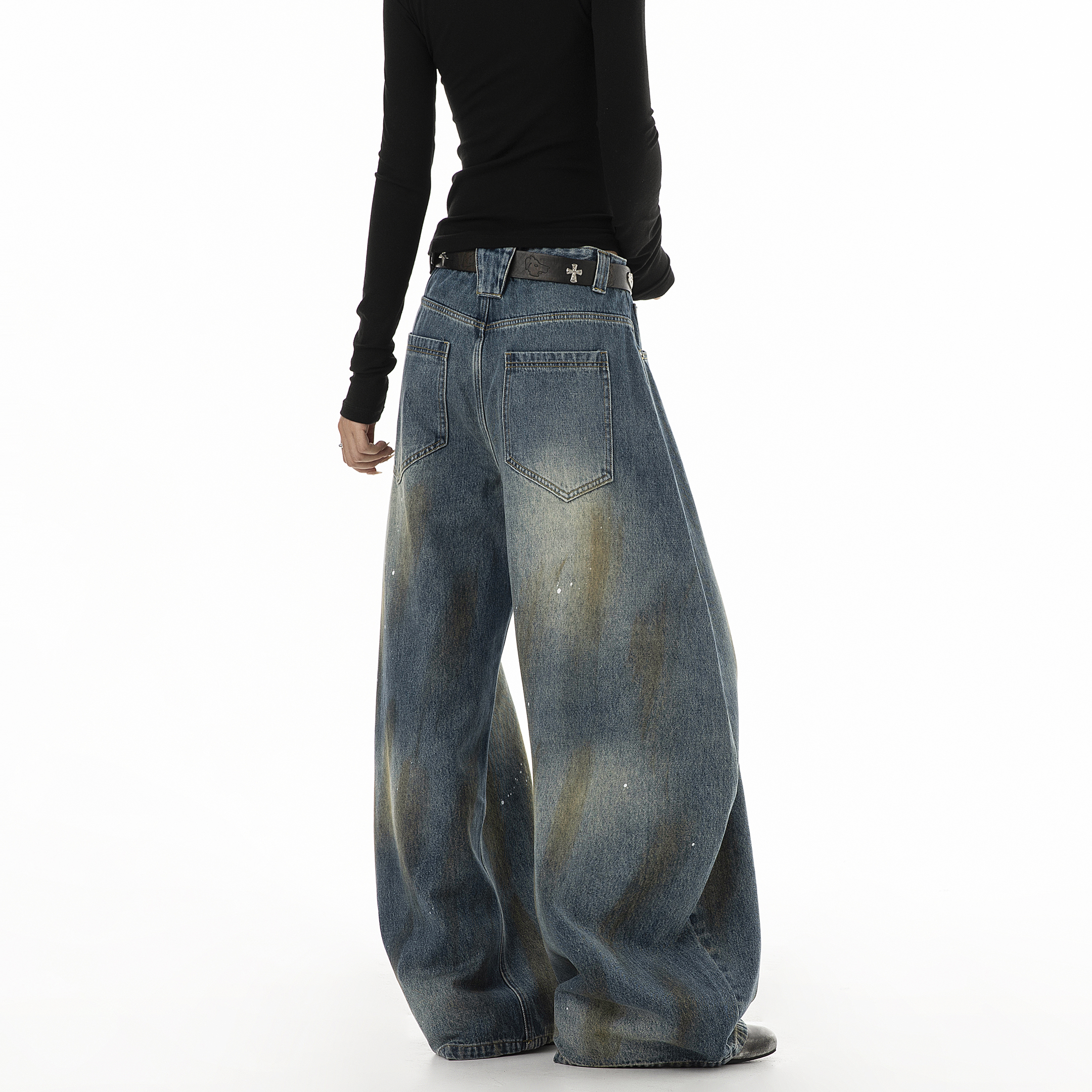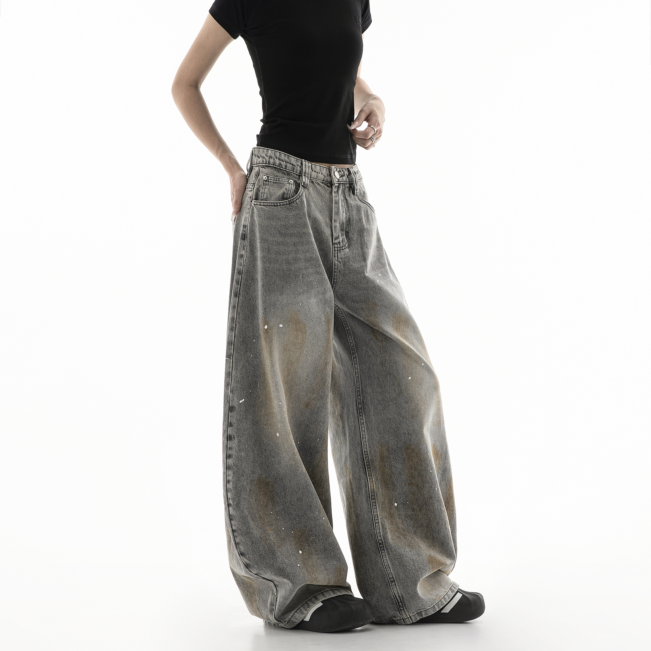 ICH MODE 美式复古做旧牛仔裤女夏季宽松直筒裤休闲阔腿弯刀裤子