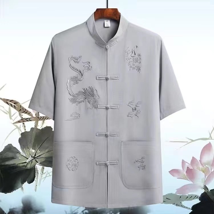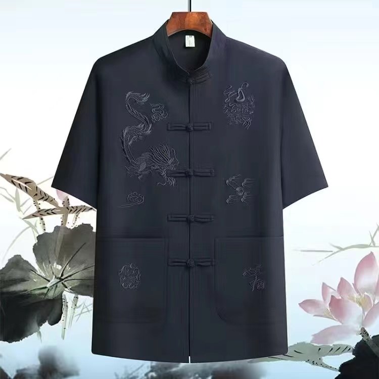夏季唐装男短袖绣花衬衣 中老年夏装爸爸装薄款冰丝棉麻老人衬衫
