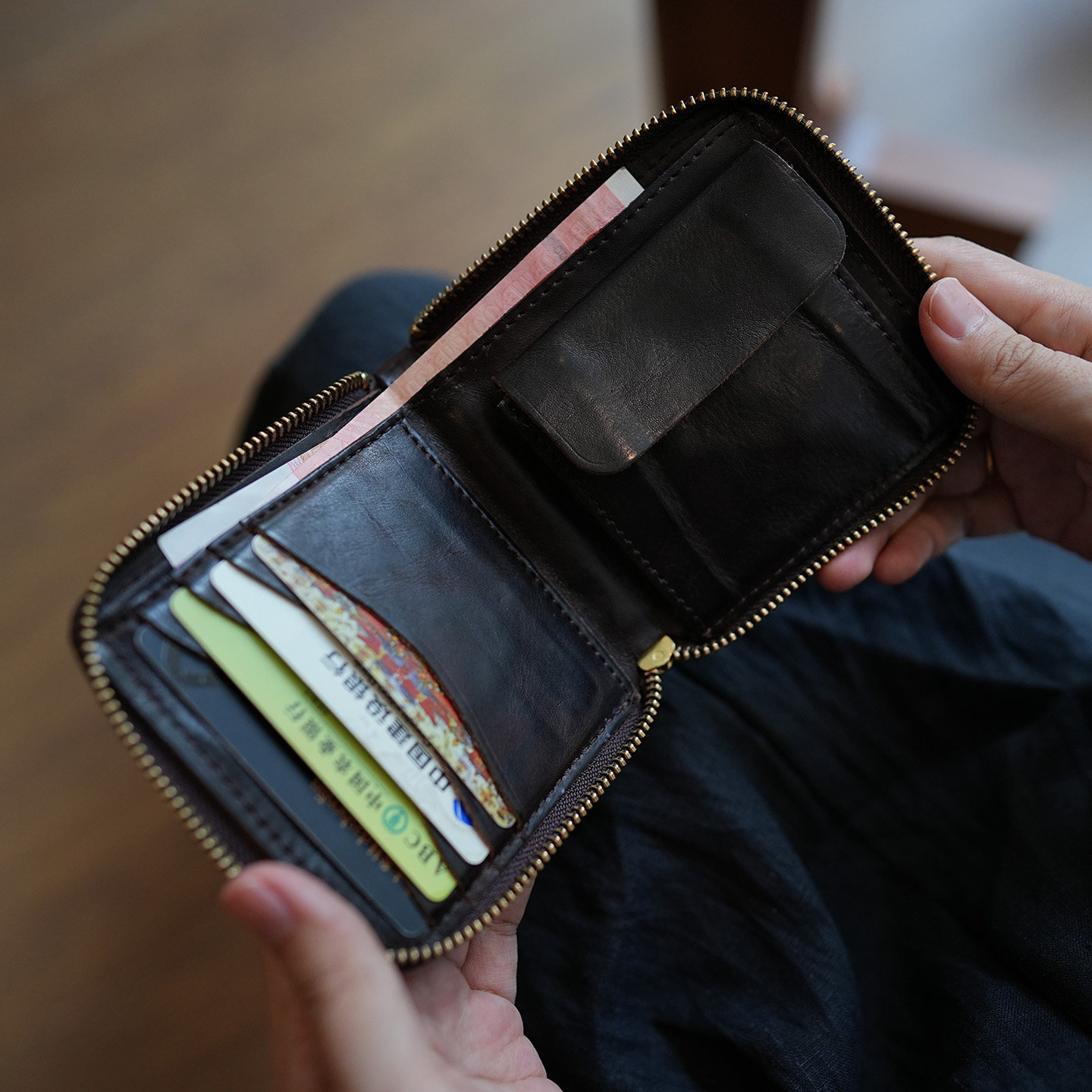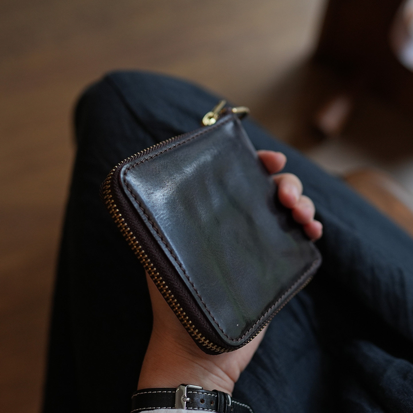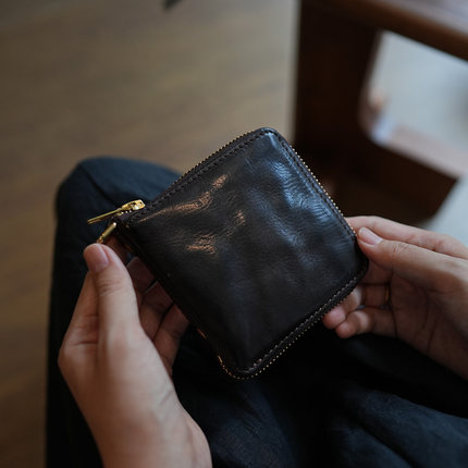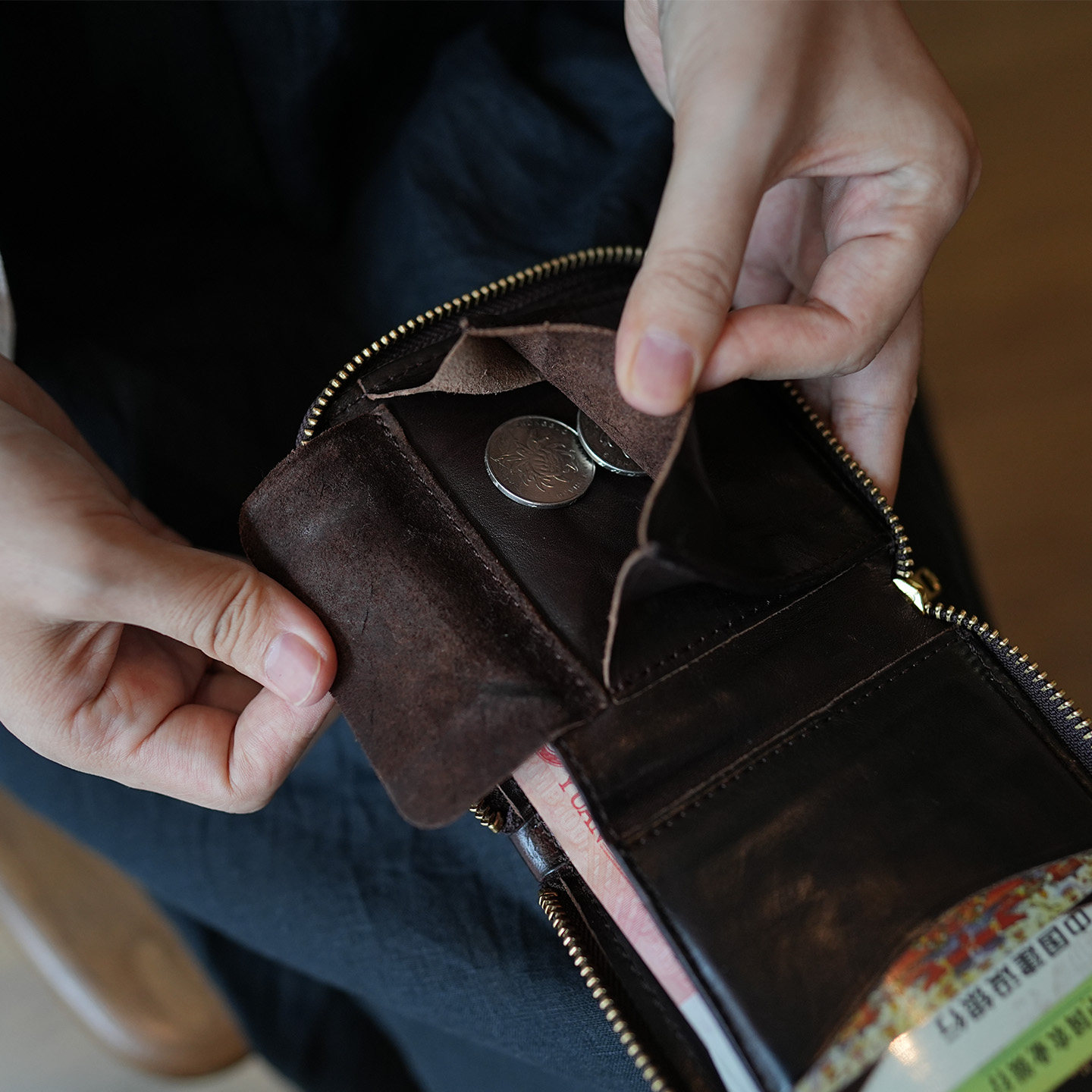 鹿小姐复古做旧植鞣牛皮便携口袋拉链短款钱夹真皮银行卡零钱包