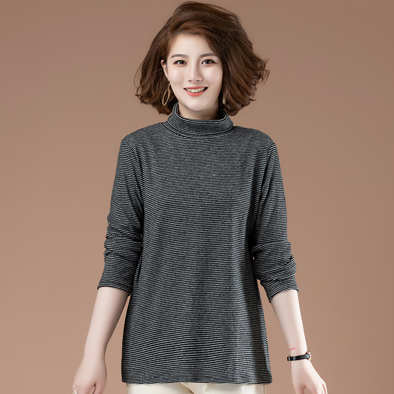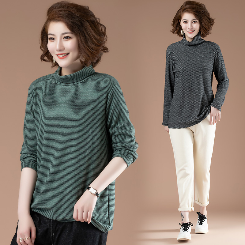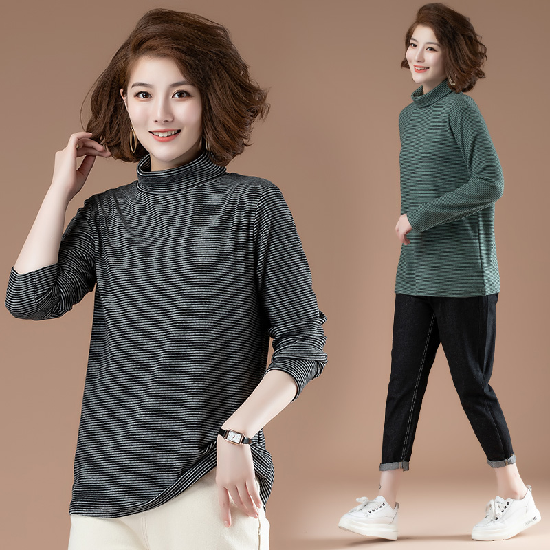 秋冬中长款条纹半高领打底衫女中年妈妈大码女装宽松显瘦长袖T恤