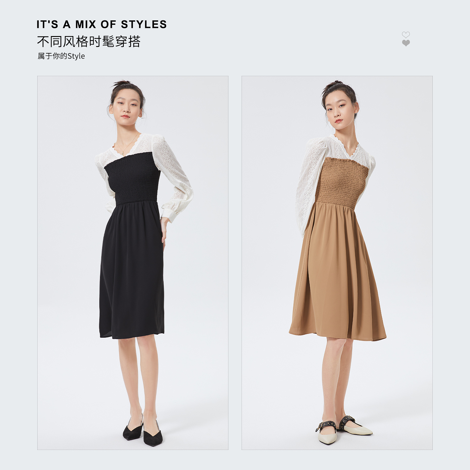 爱居兔夏季新品女装中长裙V领打揽收腰蕾丝拼接长袖连衣裙女