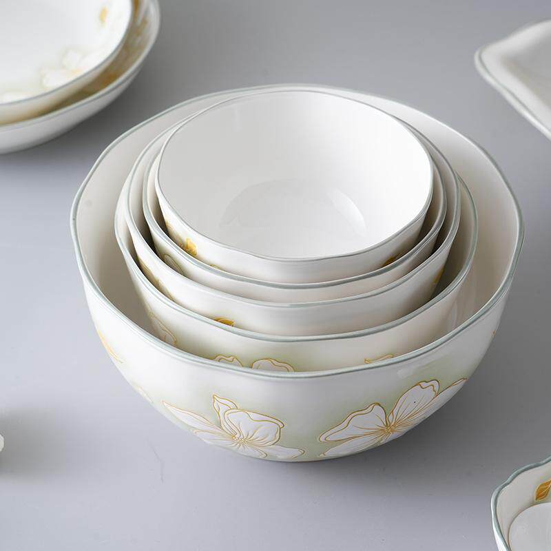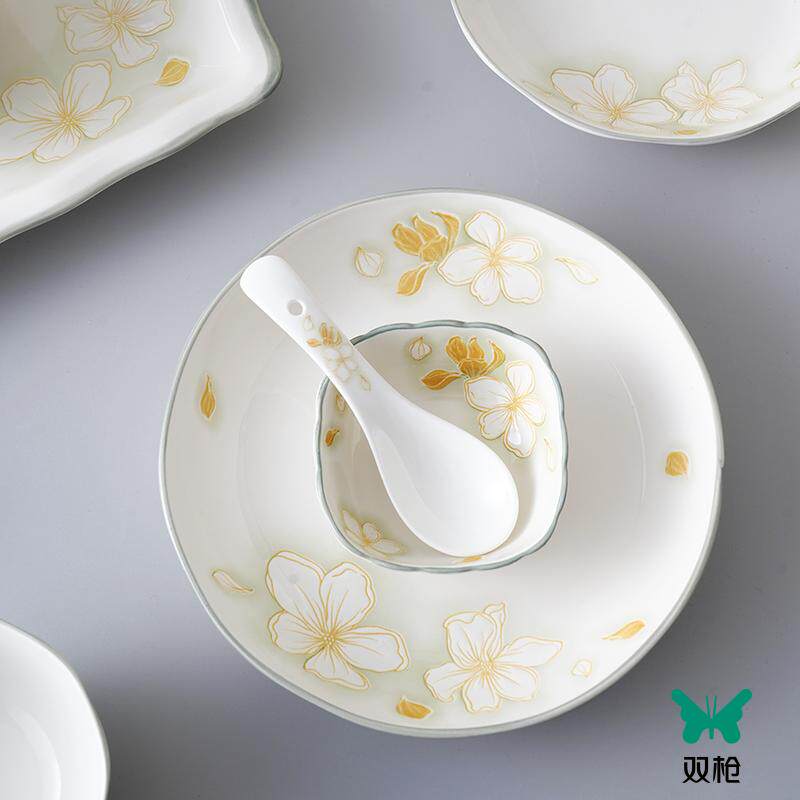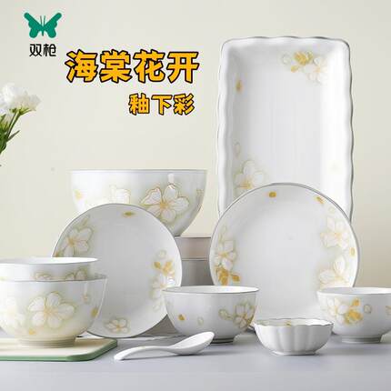 双枪陶瓷餐具海棠花开釉下彩饭碗盘子调味碟鱼盘汤碗汤勺瓷器套装