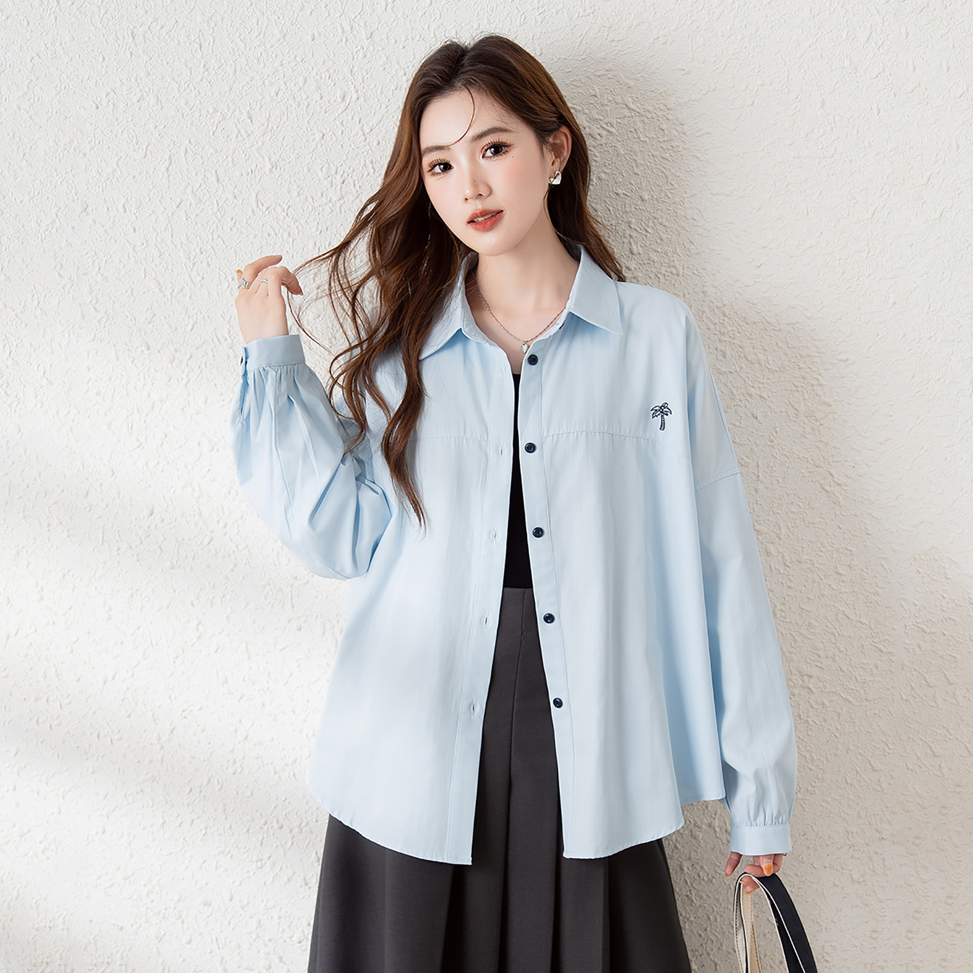 唐狮2025年新款长袖衬衫女蓝色翻领宽松净色百搭休闲设计感上衣bl