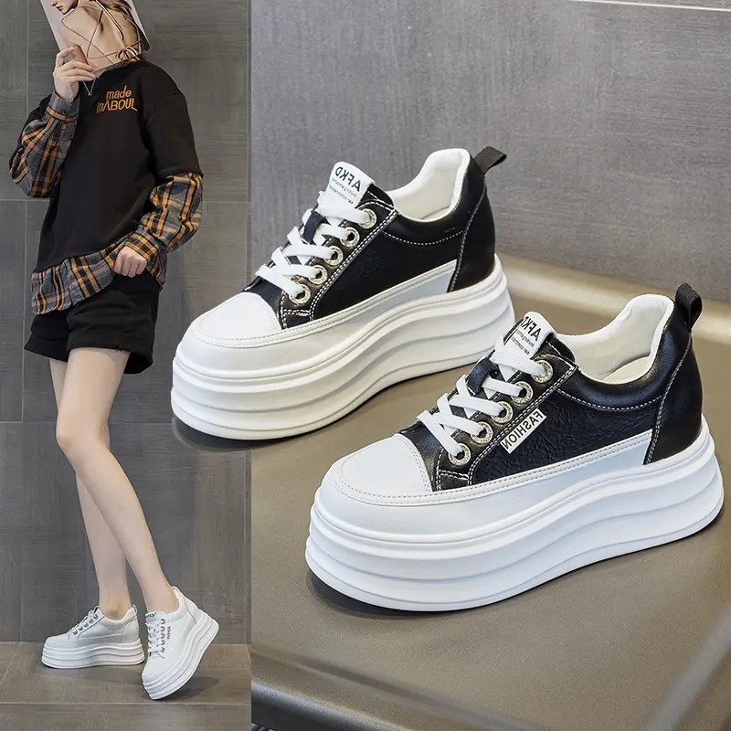 内增高小白鞋女2025新款厚底网面透气真皮10CM休闲四季松糕女板鞋