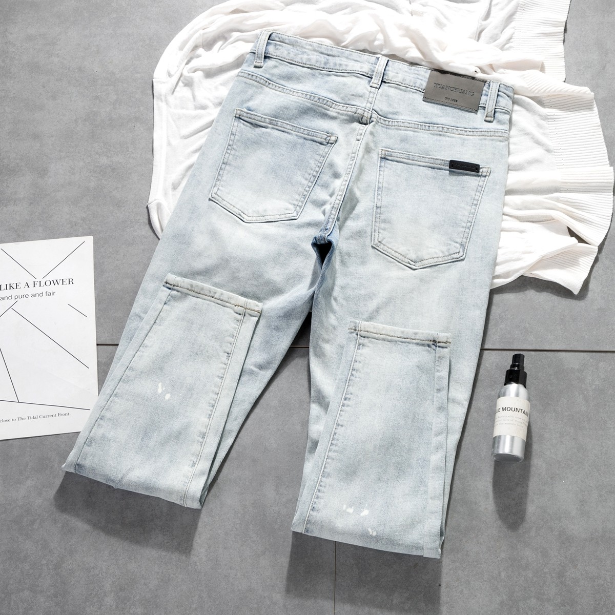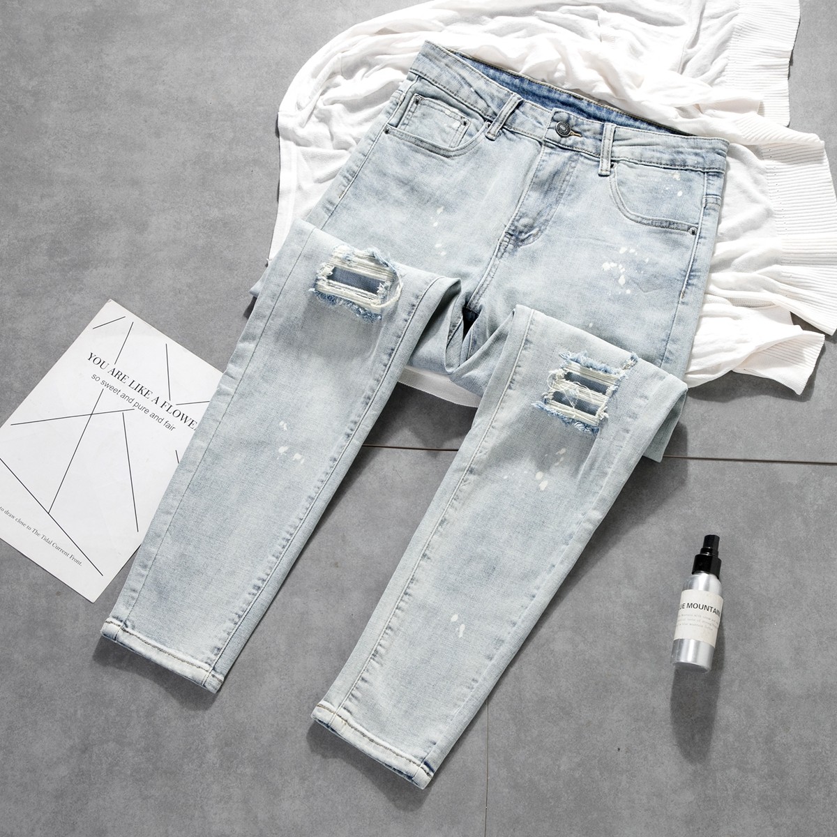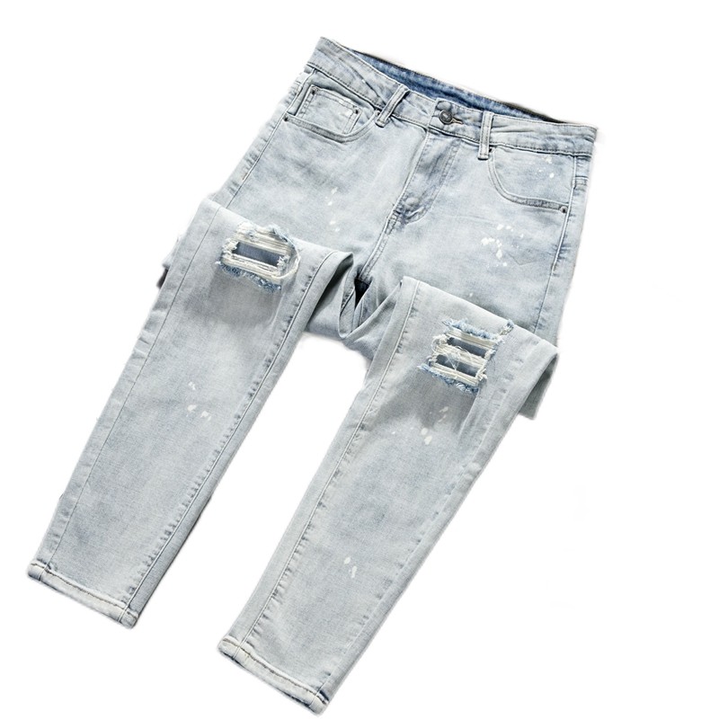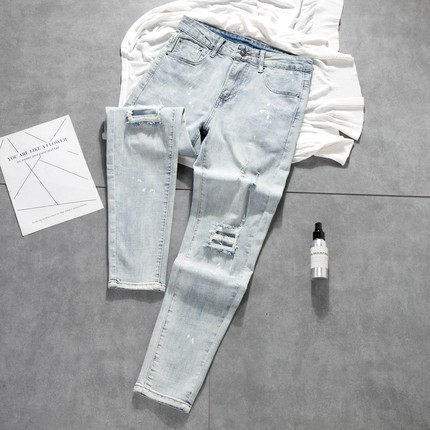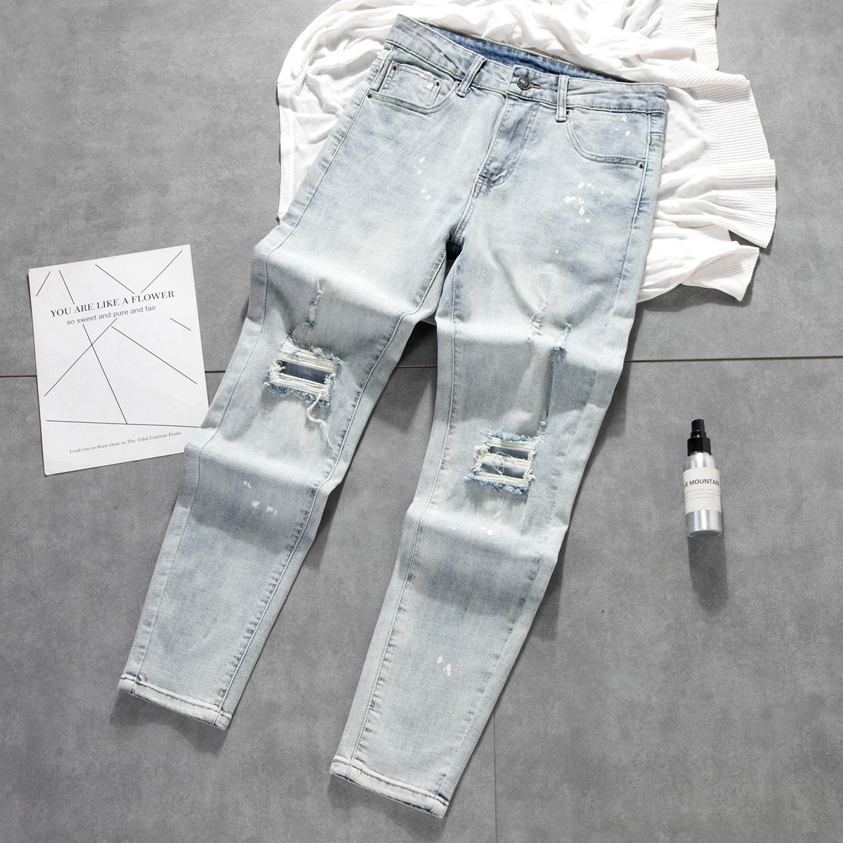 2024春季新款泼墨破洞补丁浅色牛仔长裤男修身小脚韩版弹力休闲潮