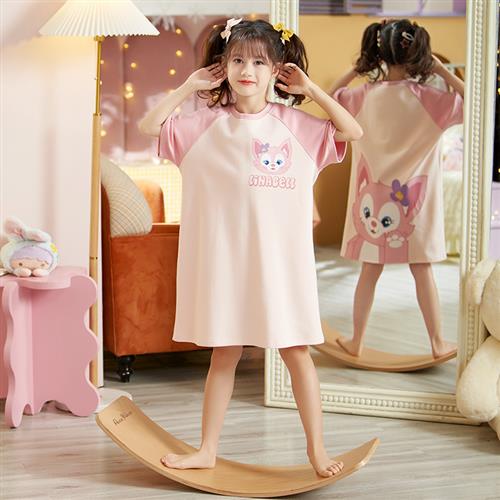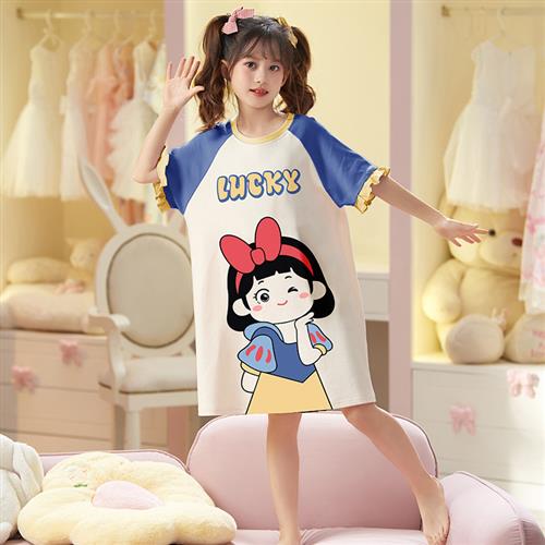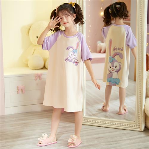 儿童睡裙女童夏季纯棉薄款短袖可爱中大童小女孩公主风睡衣家居服