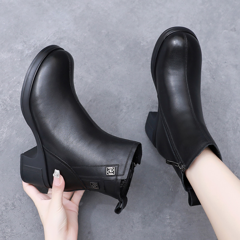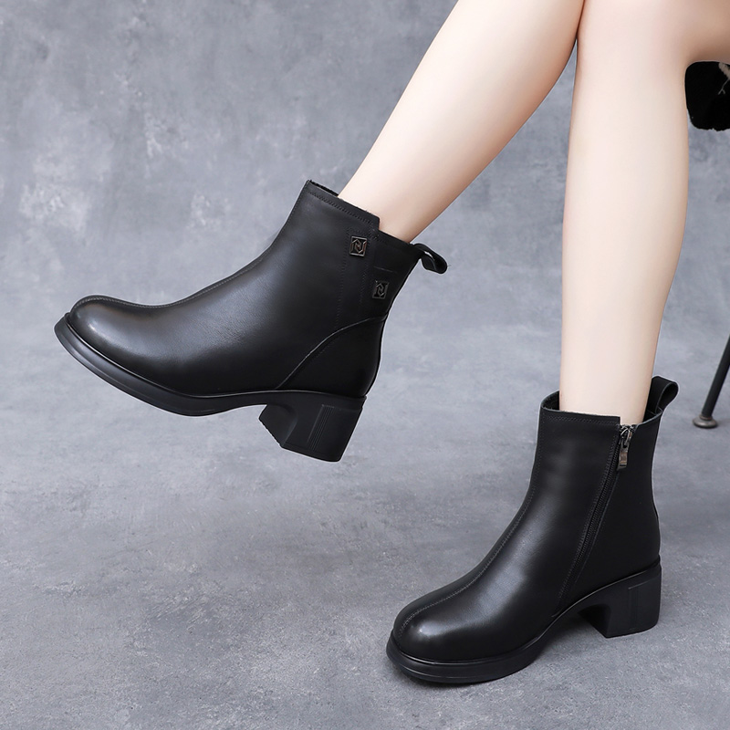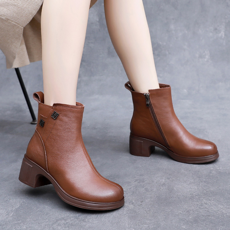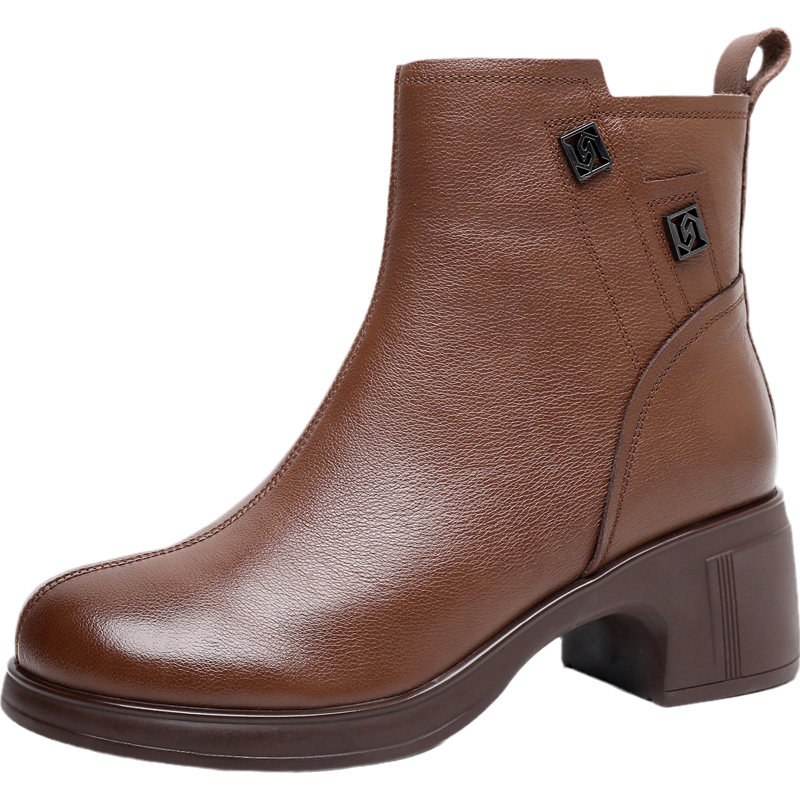 粗跟真皮女靴女士秋冬短靴2025新款妈妈鞋大码加绒靴子高跟马丁靴
