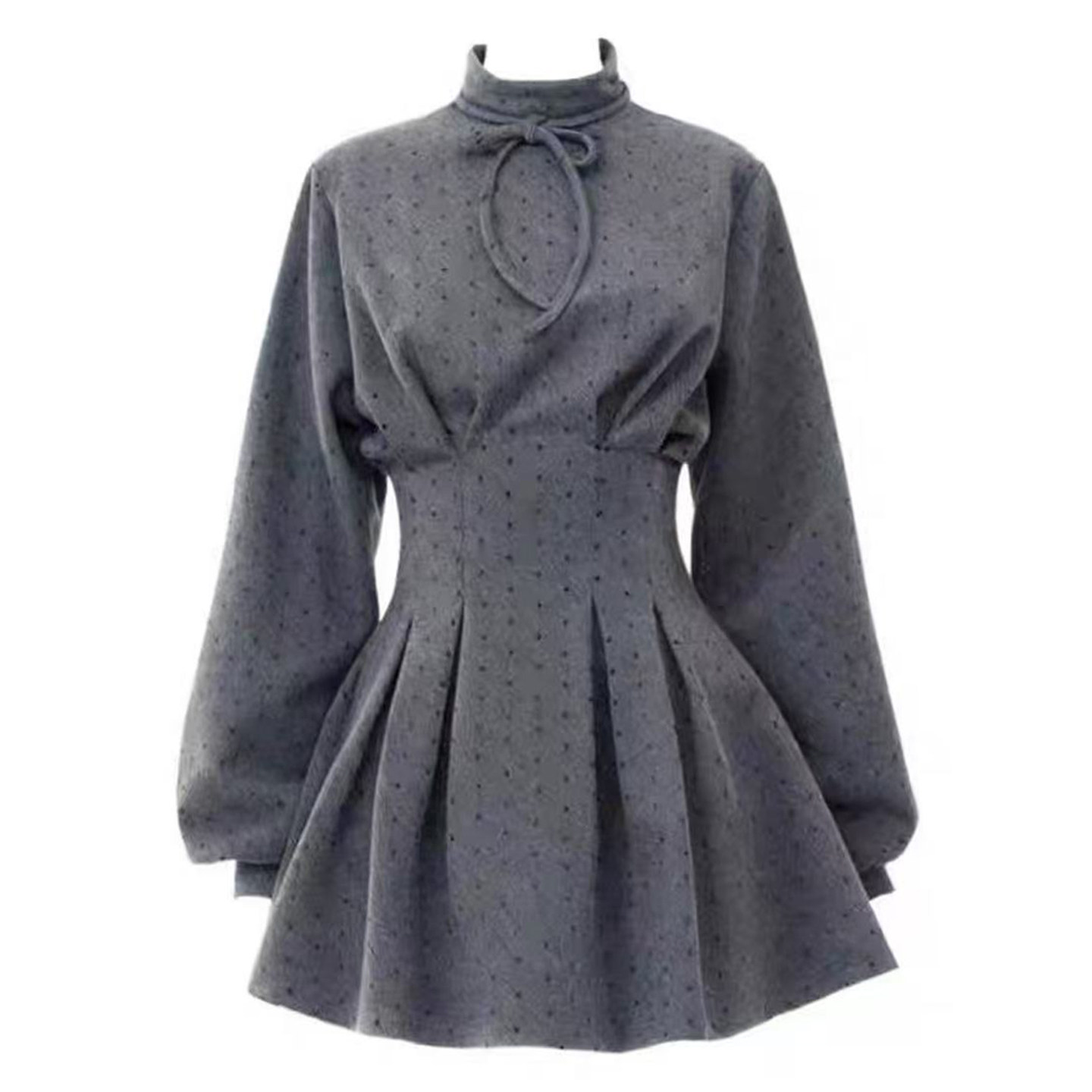自制设计感法式灰色波点收腰长袖连衣裙衬衫裙女秋冬短款裙子短裙