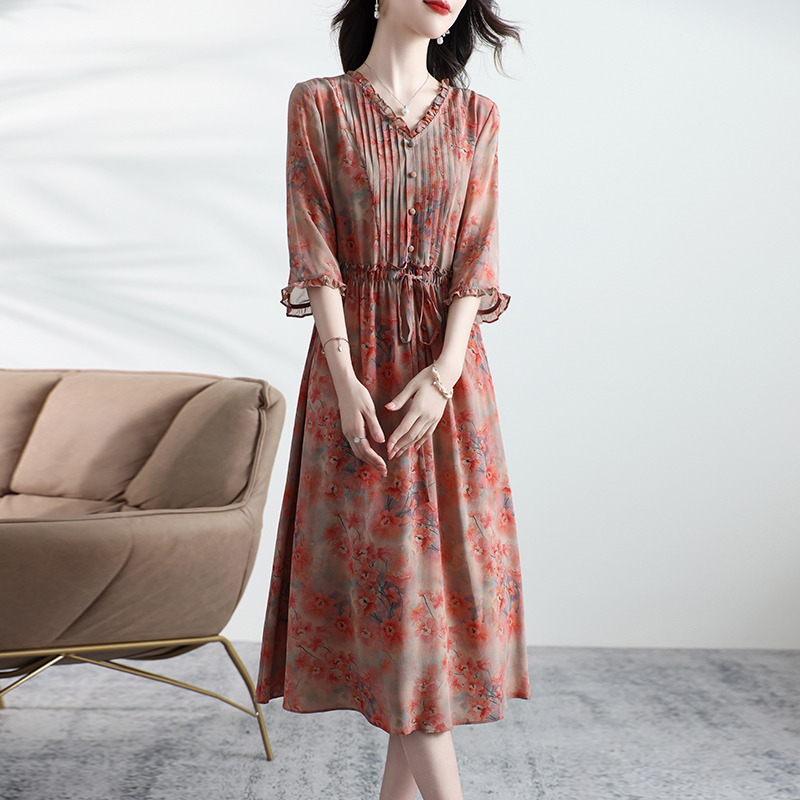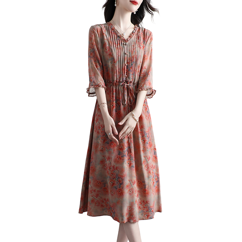 新款真丝连衣裙女士时尚印花中袖桑蚕丝重绉收腰显瘦裙子气质夏季
