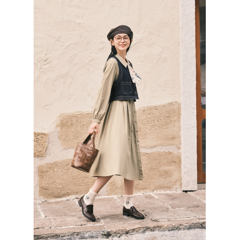 紫涵复古牛仔马甲+粉色中长款衬衫连衣裙时尚套装2024年春季新款