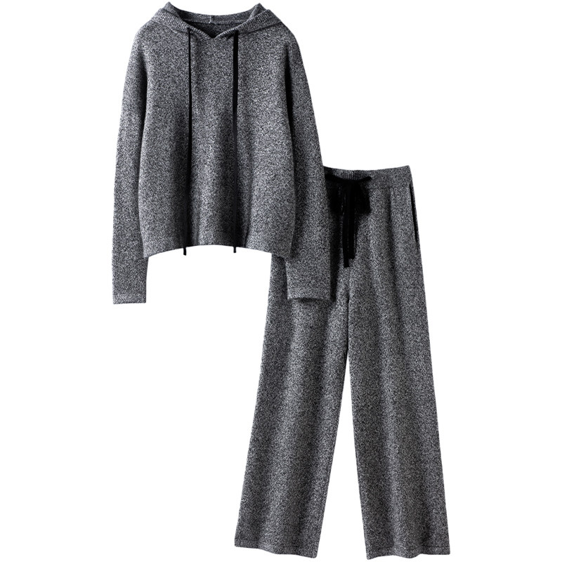 黑白!连帽套头常规长袖上衣宽松型直筒阔腿针织裤羊绒套装女显瘦