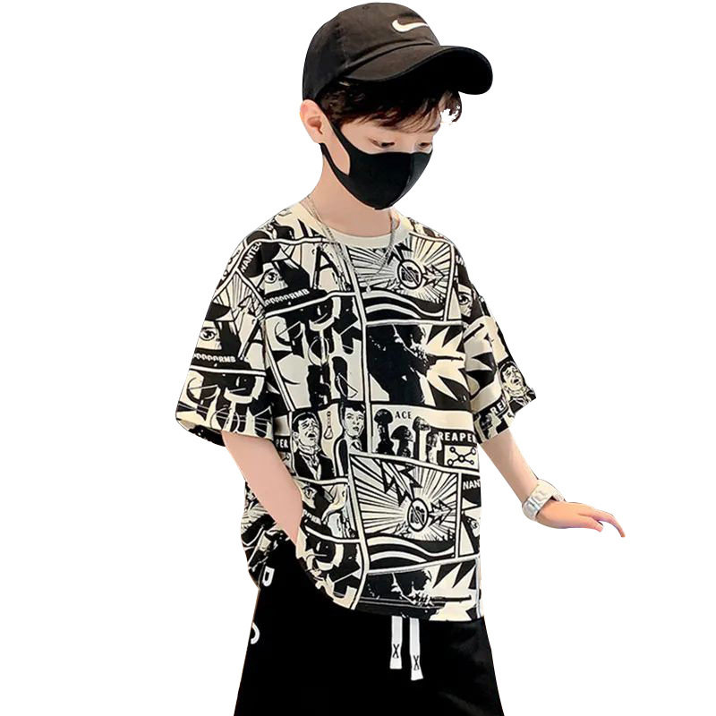 中大童薄款个性短袖T恤2025新款儿童男孩夏装潮洋气男童夏季套装