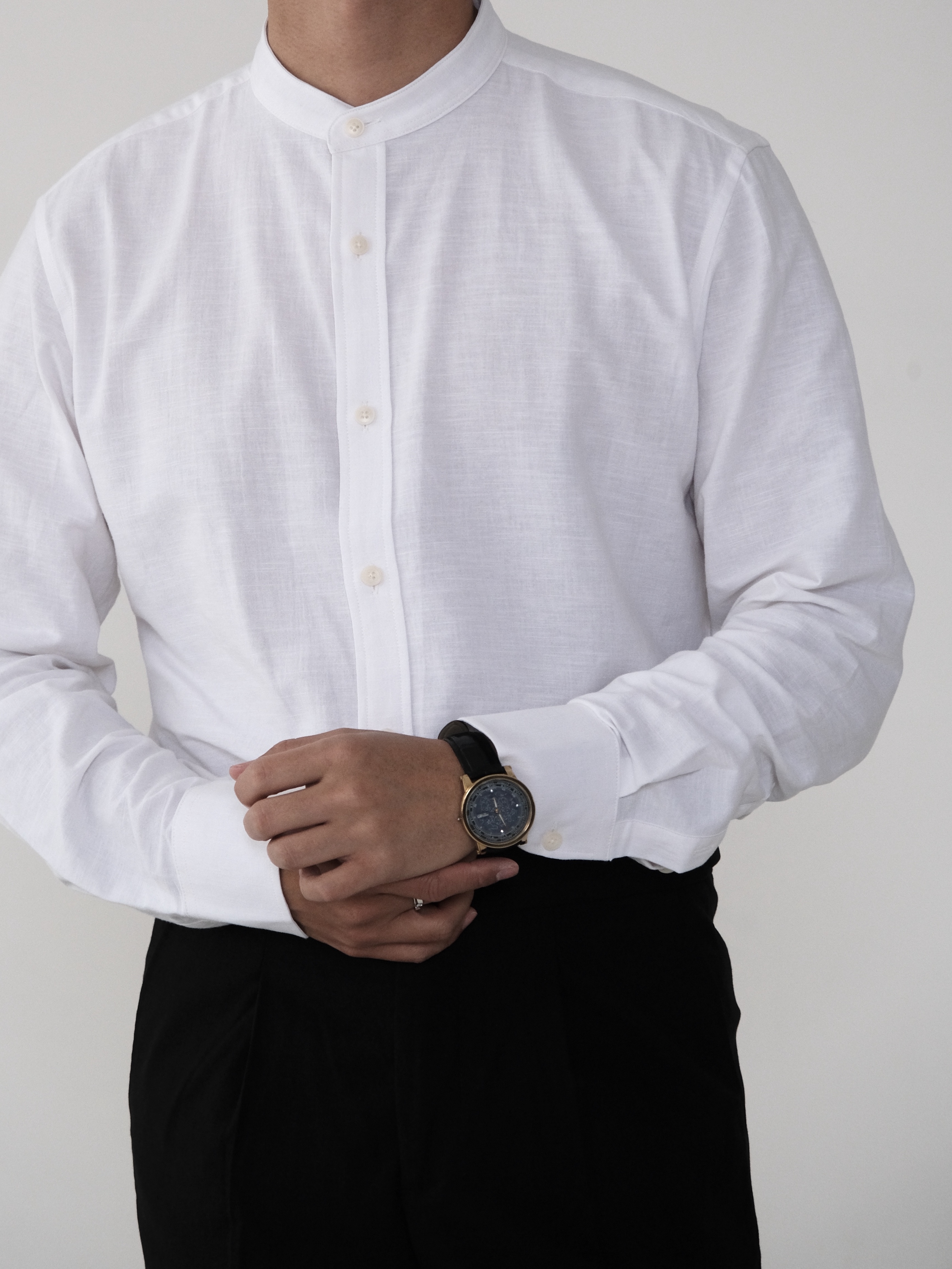 何青菜/241021 春款亚麻透气舒适立领长袖日常商务休闲绅士衬衫男
