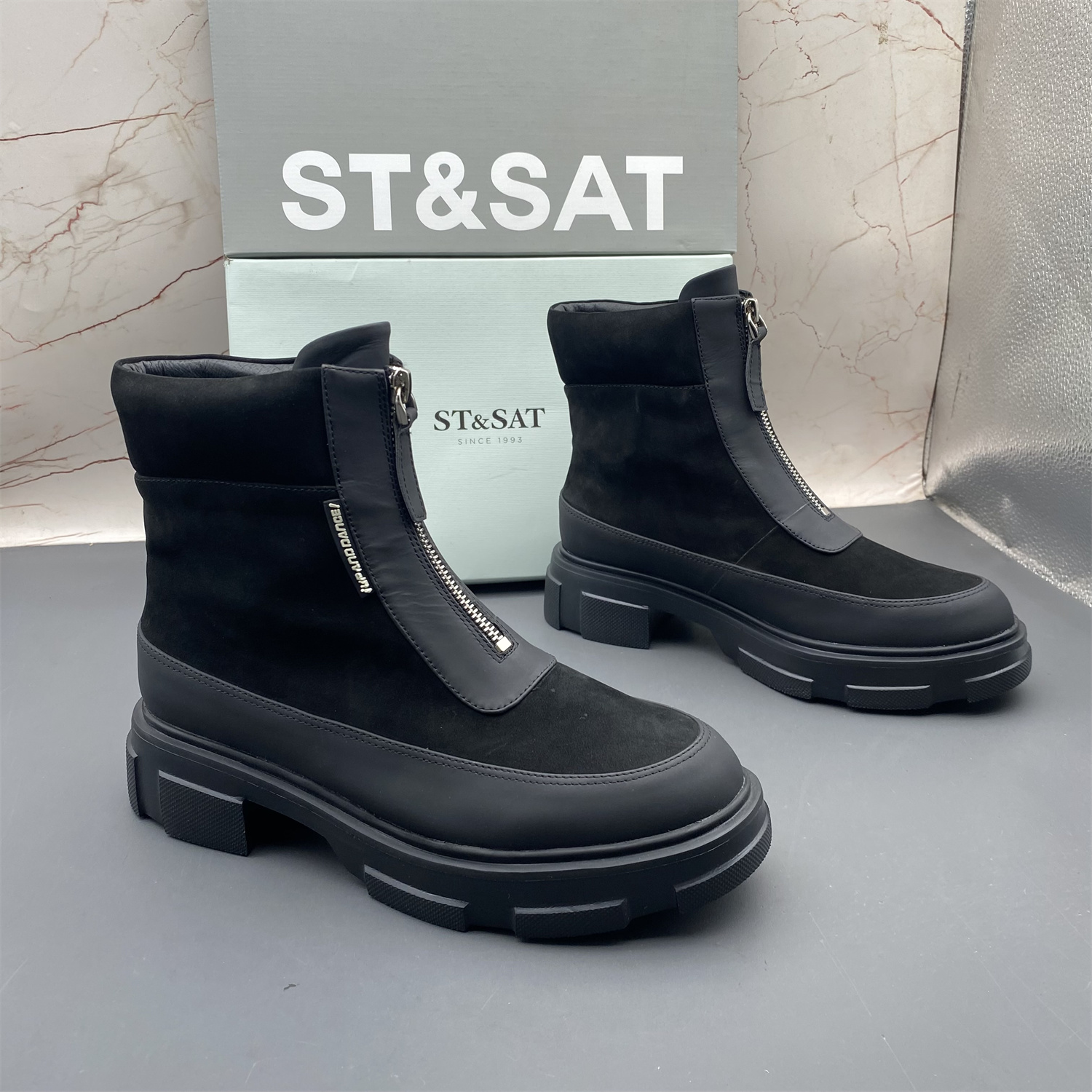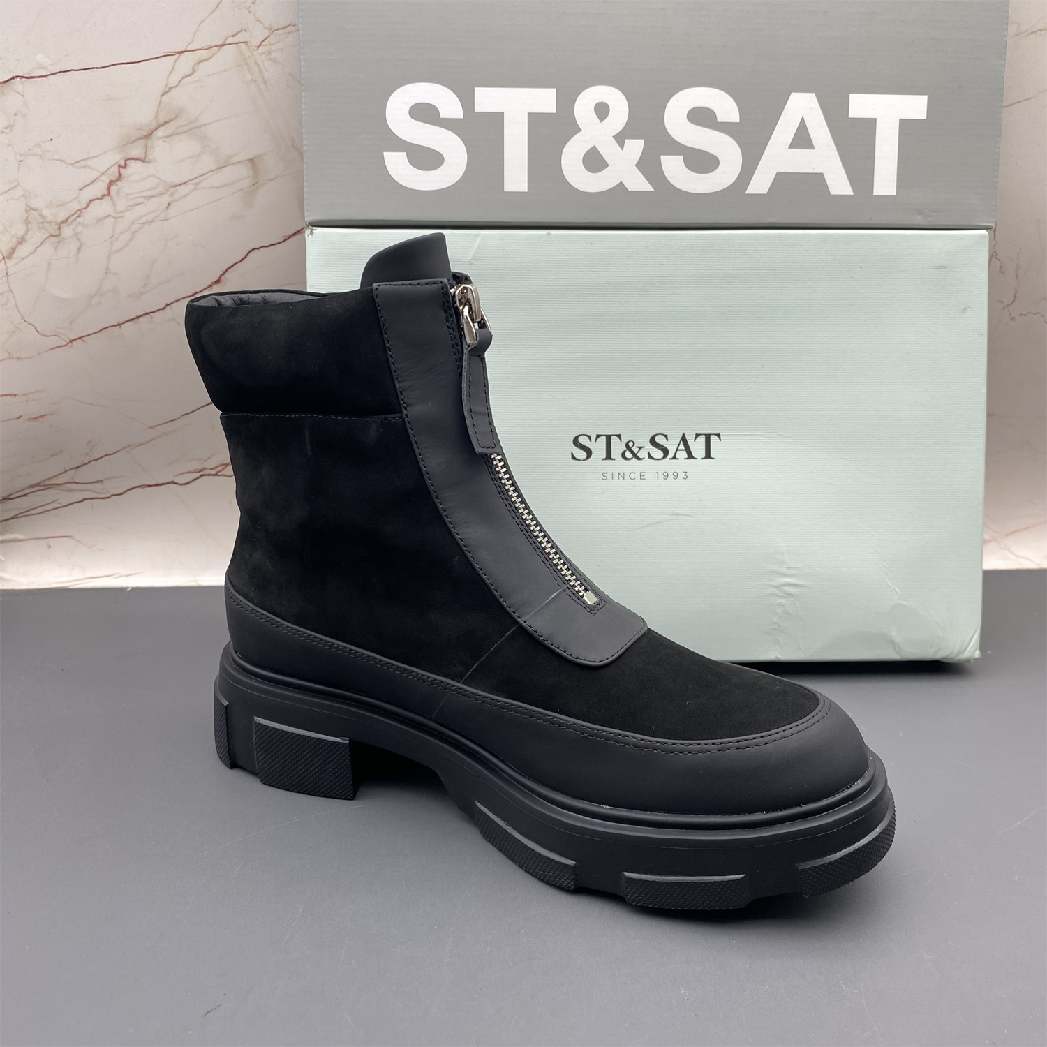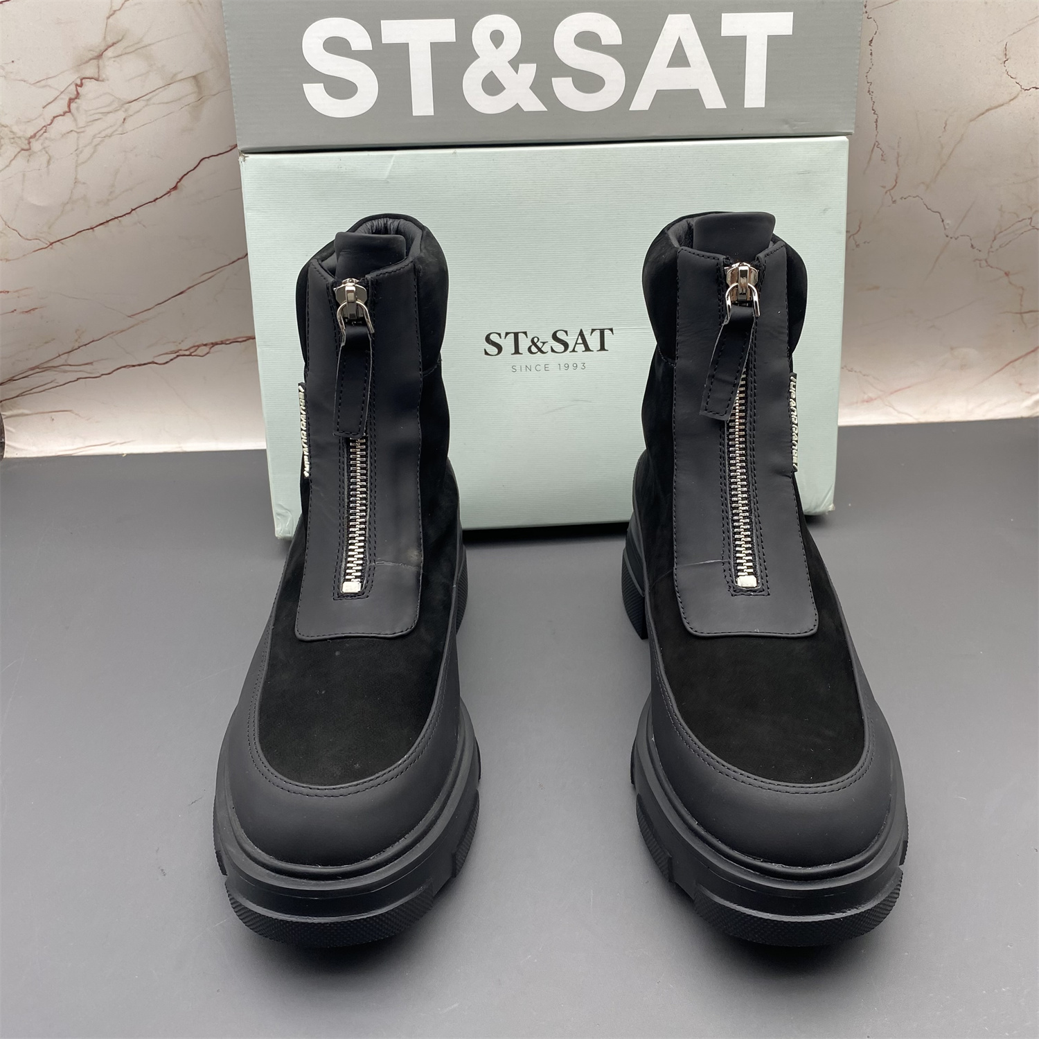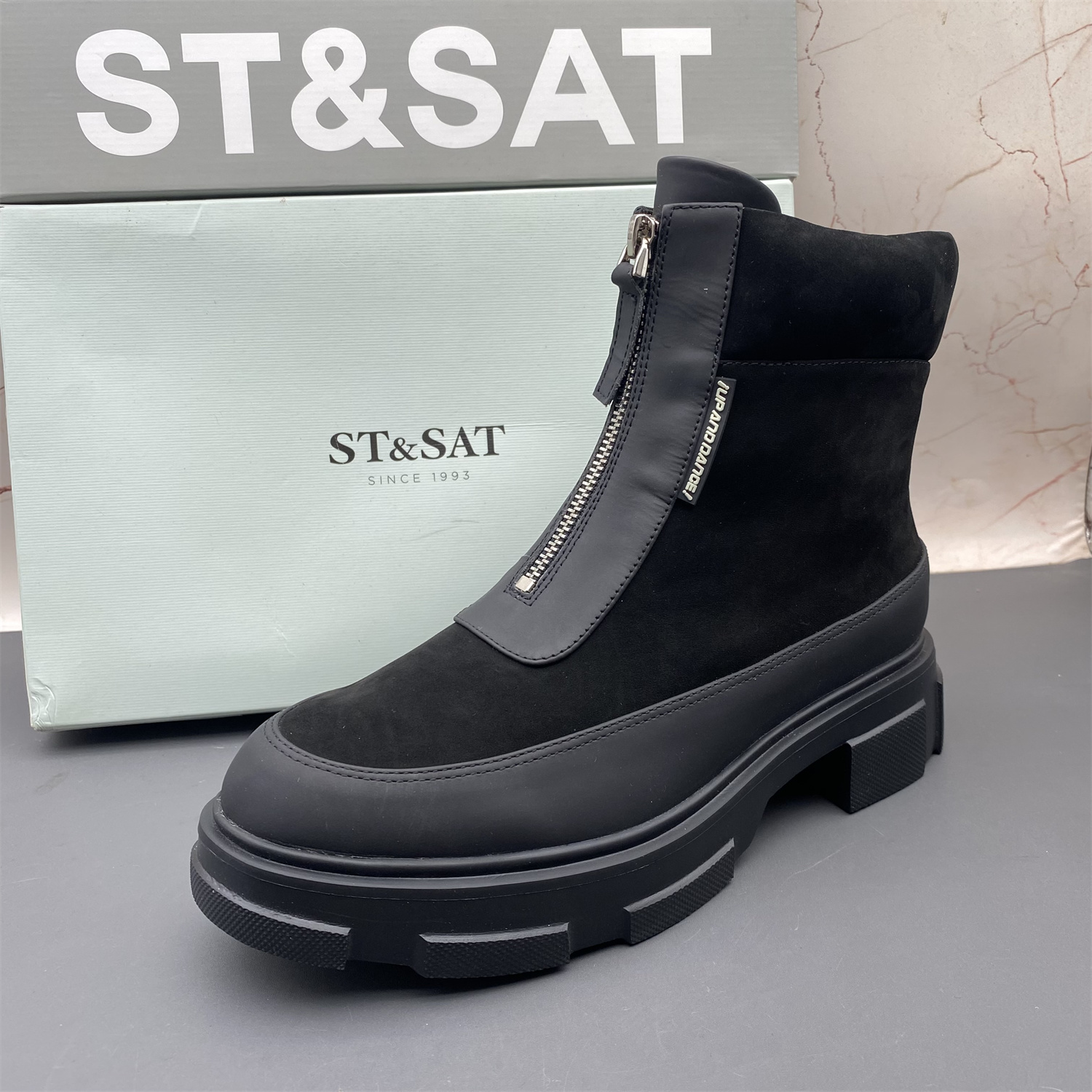 正品ST&SAT星期六撤柜断码牛皮女鞋平底防滑圆头前拉链时尚短靴