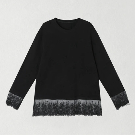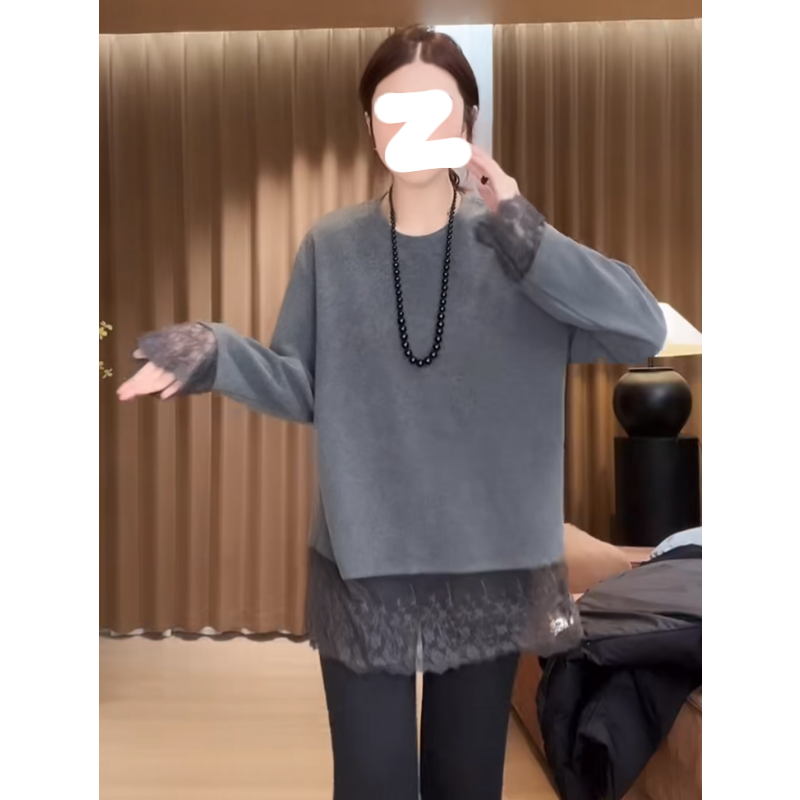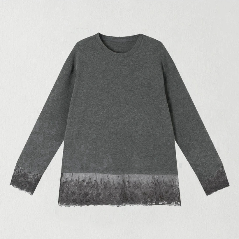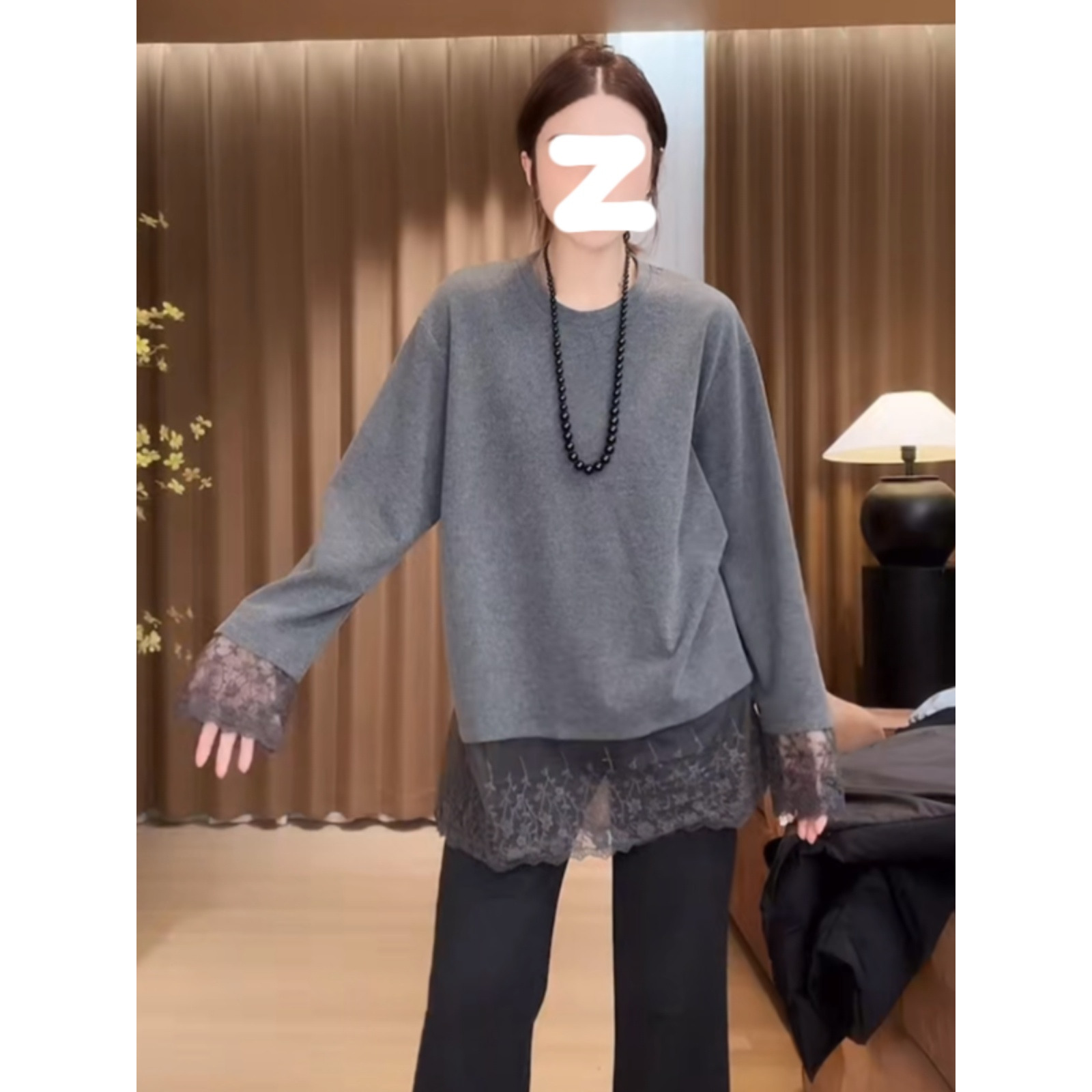 百搭蕾丝遮臀T恤女秋季韩版小众拼接遮臀宽松厚款长袖中长款上衣