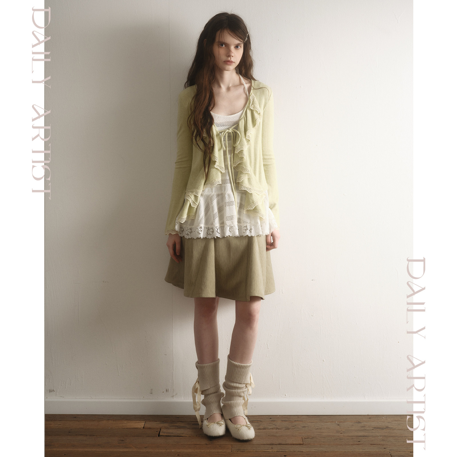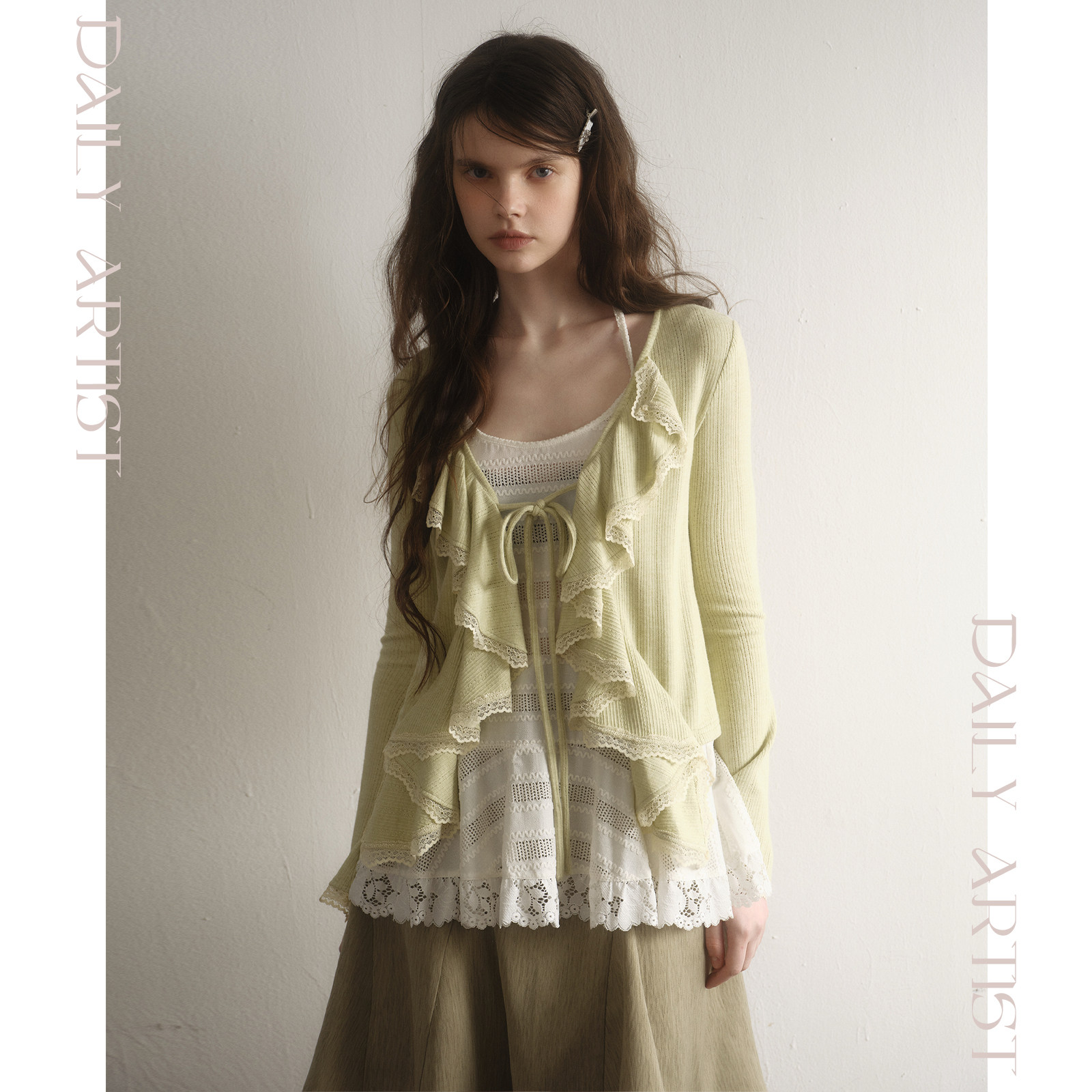 今日艺术家原创森系绿色蕾丝吊带叠穿针织开衫鱼尾半裙套装