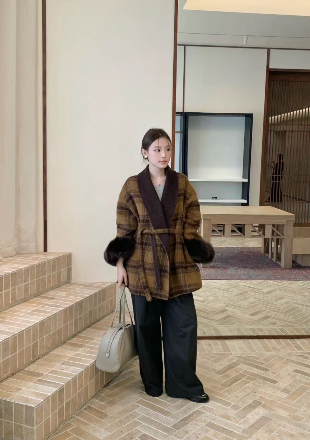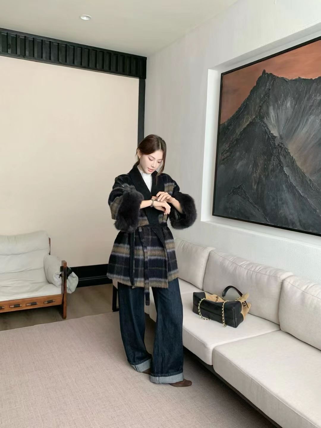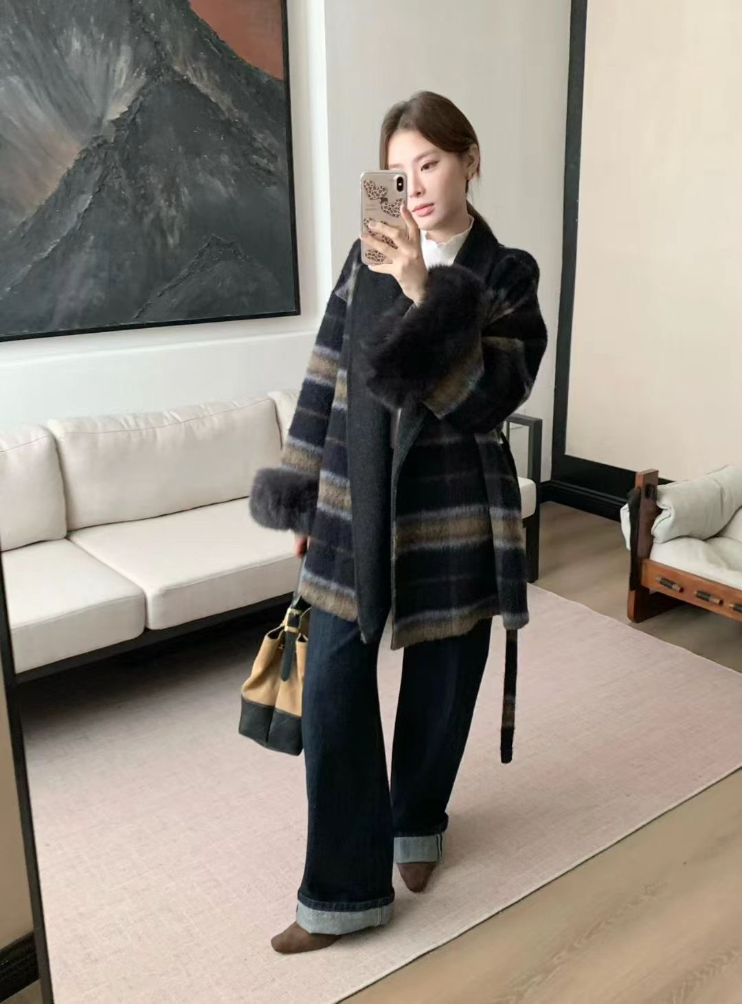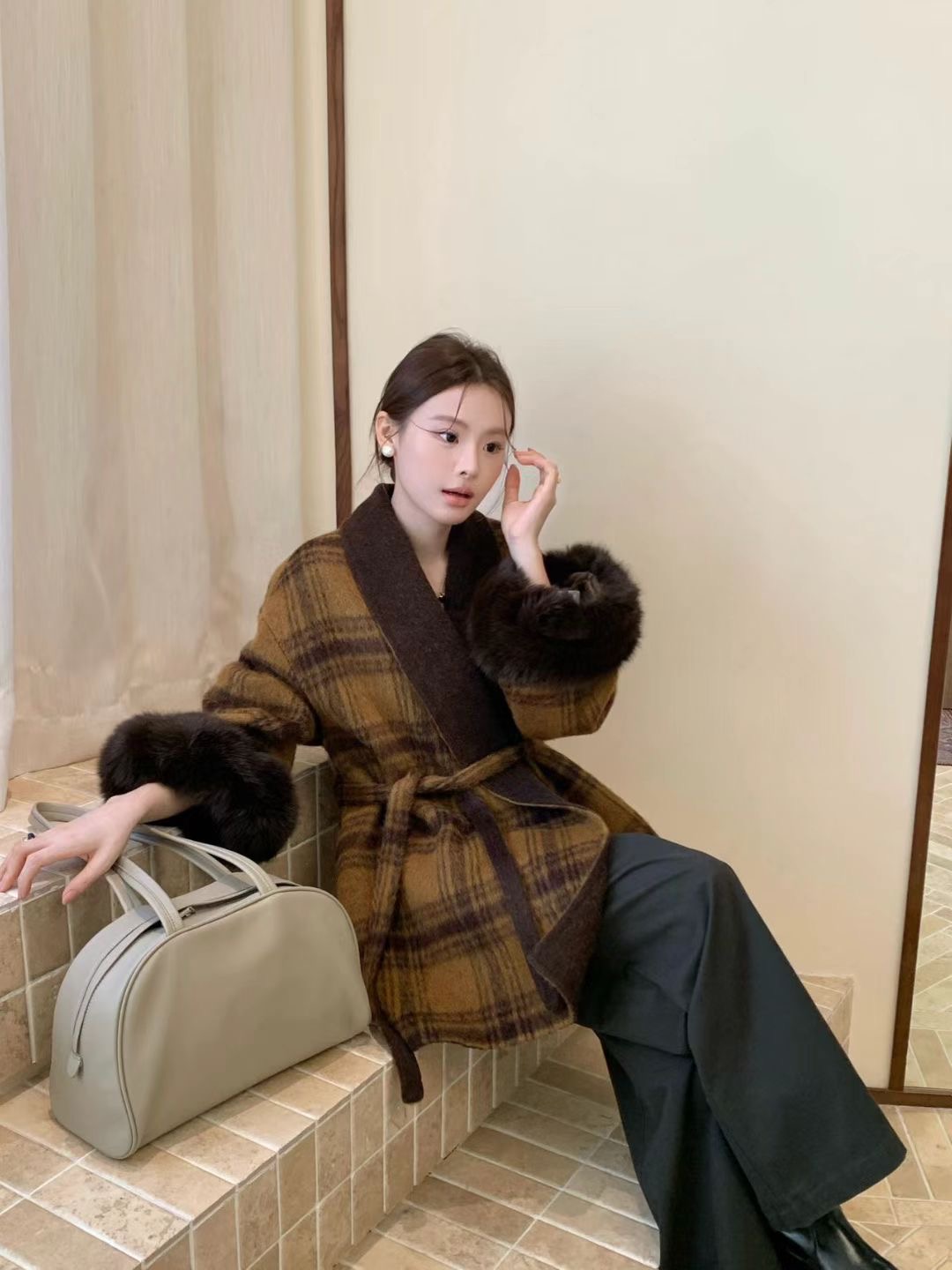韩国定制SEVEN秋冬2025新款狐狸毛双面呢羊绒大衣中长款毛呢外套