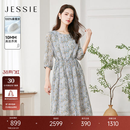 【丝与墨影】JESSIE优雅印花100%桑蚕丝抽绳收腰真丝连衣裙女夏新