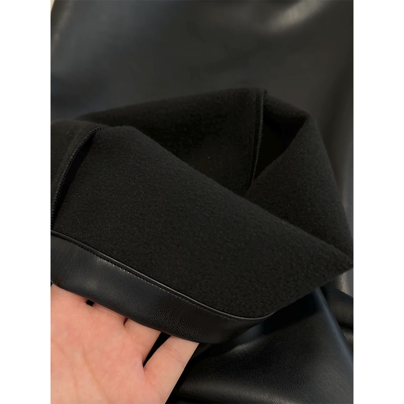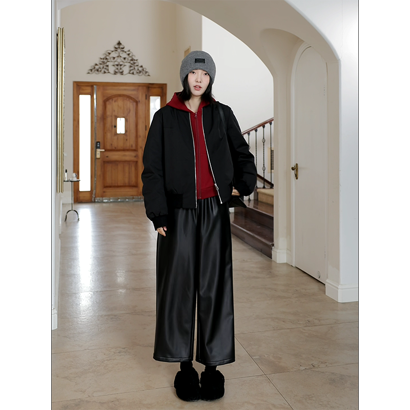 郭九九呢 帅气宽松显瘦松紧腰加绒九分皮裤冬季百搭绒感T恤内搭