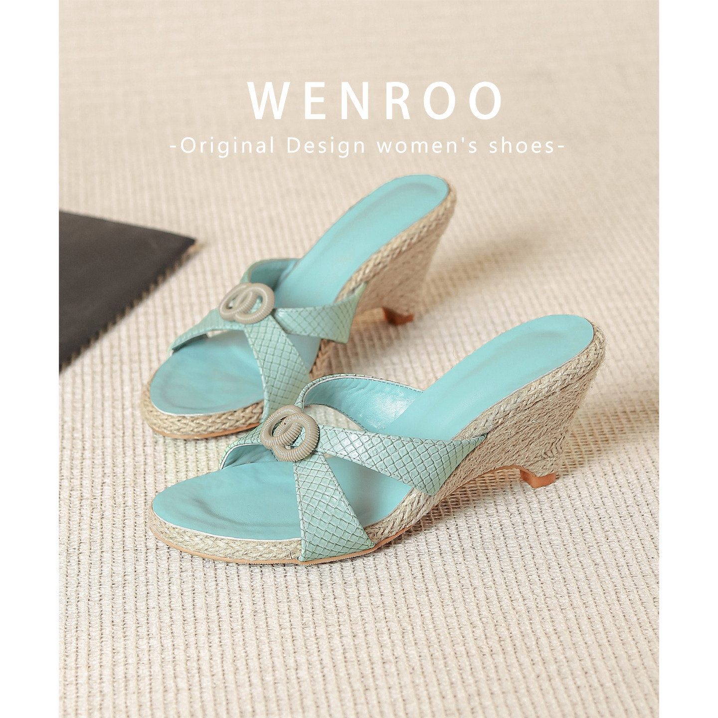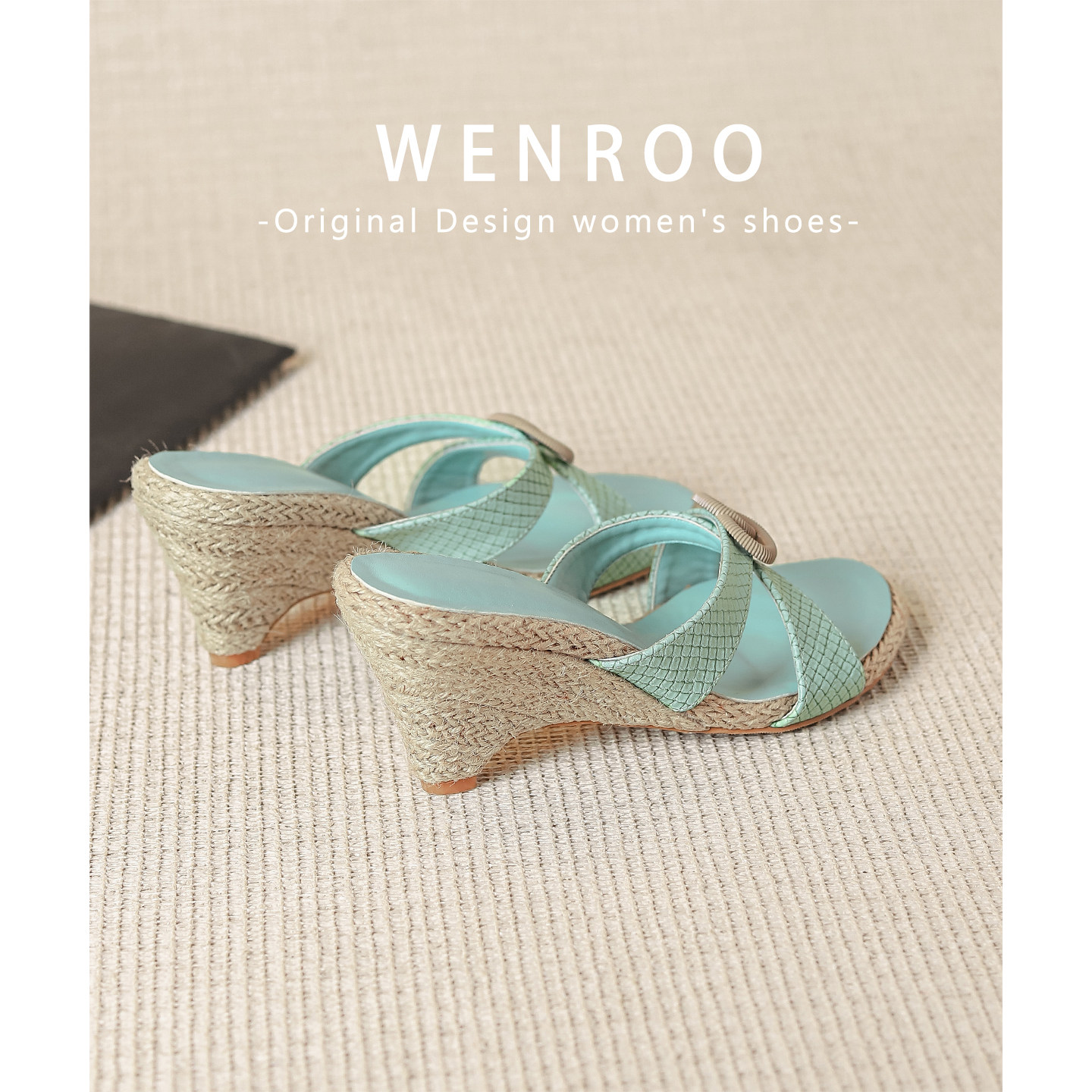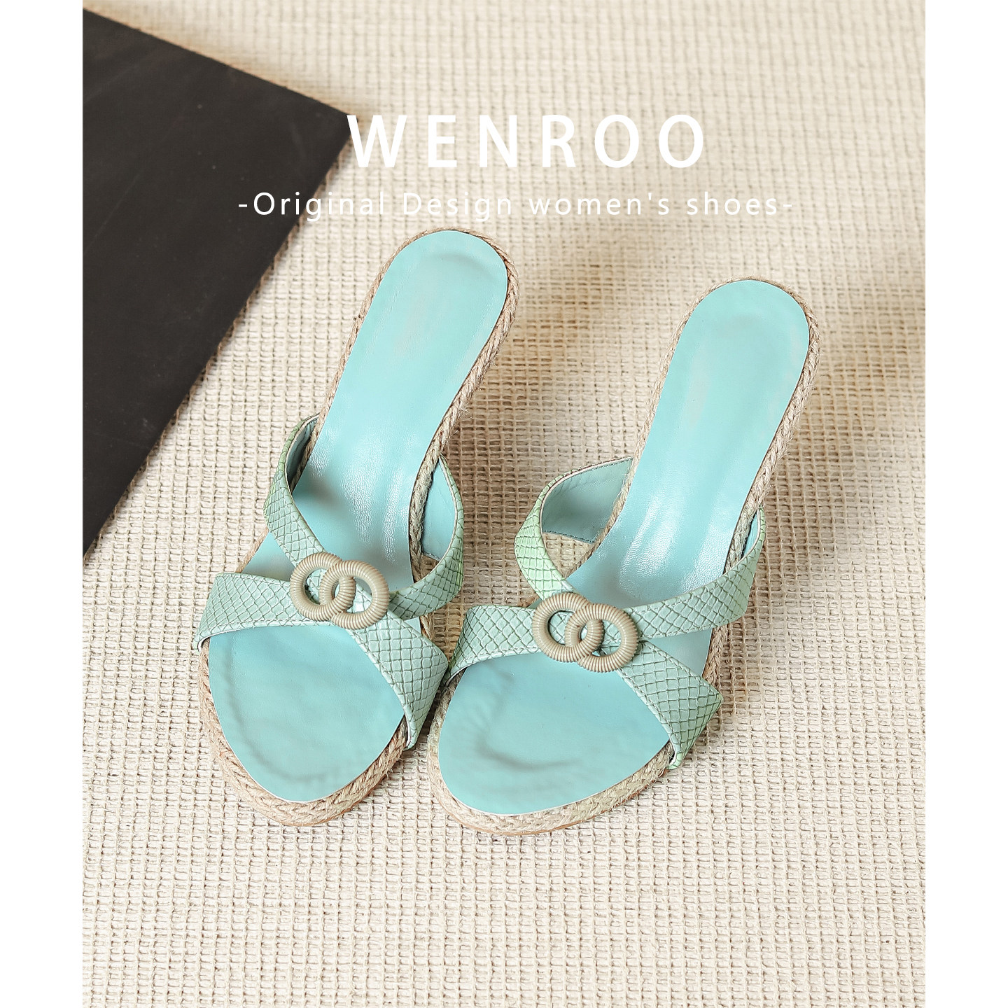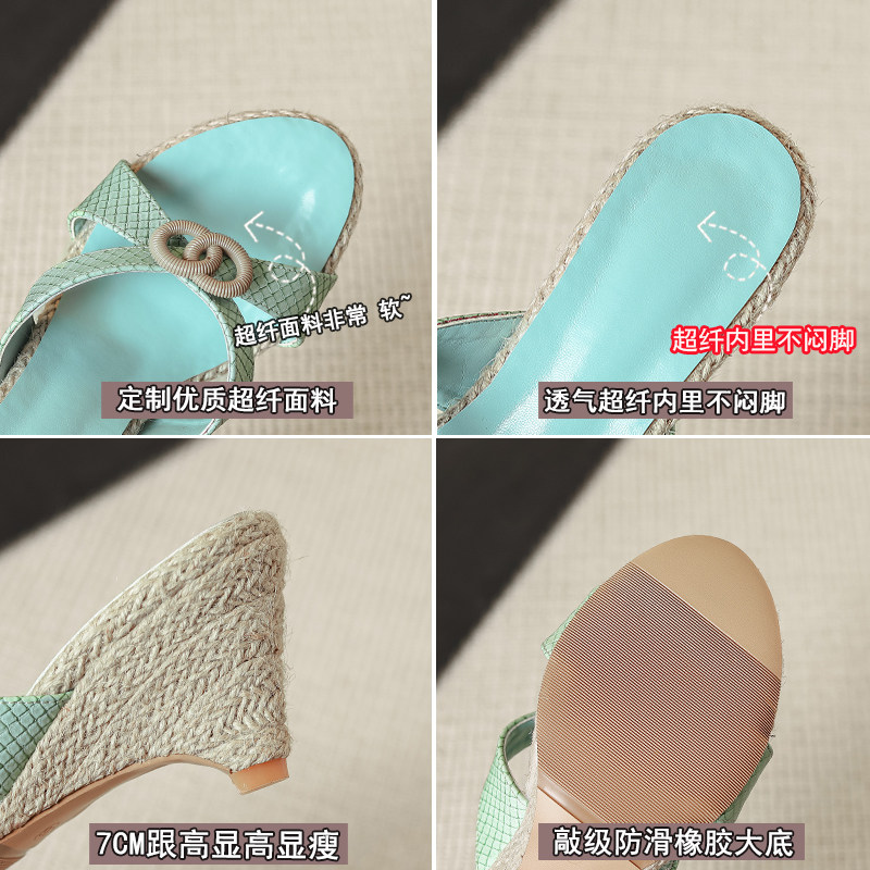 法式圆扣交叉带编织坡跟凉拖鞋女2025夏季新款复古露趾圆头高跟鞋