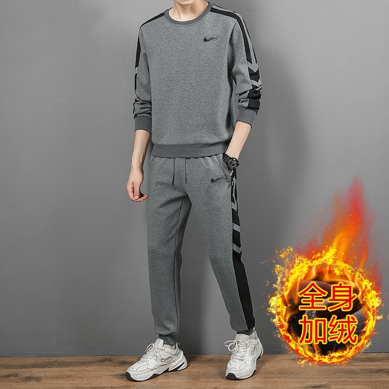 耐克顿纯棉运动套装男士秋冬季加绒加厚圆领卫衣保暖束脚卫裤一套
