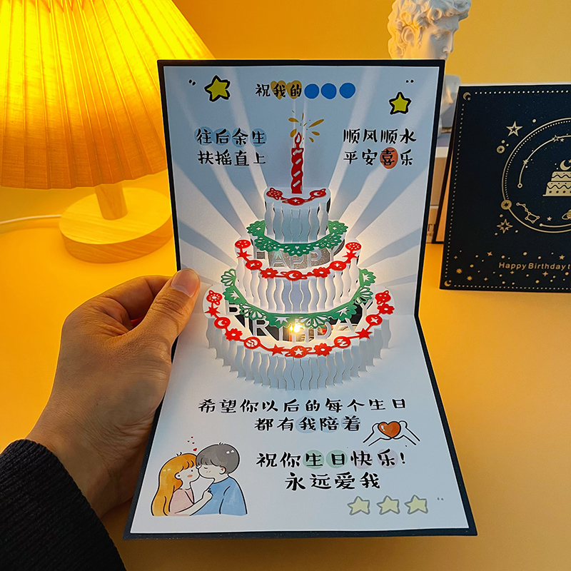 手绘生日贺卡自动音乐灯光星河立体蛋糕小红书插画创意高级感定制