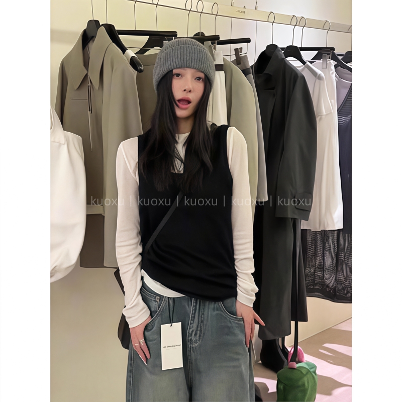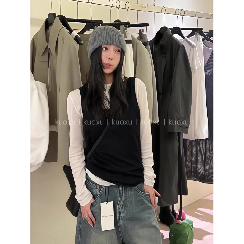 日常早春穿搭女叠穿t恤打底衫无袖马甲背心牛仔九分裤高腰阔腿裤