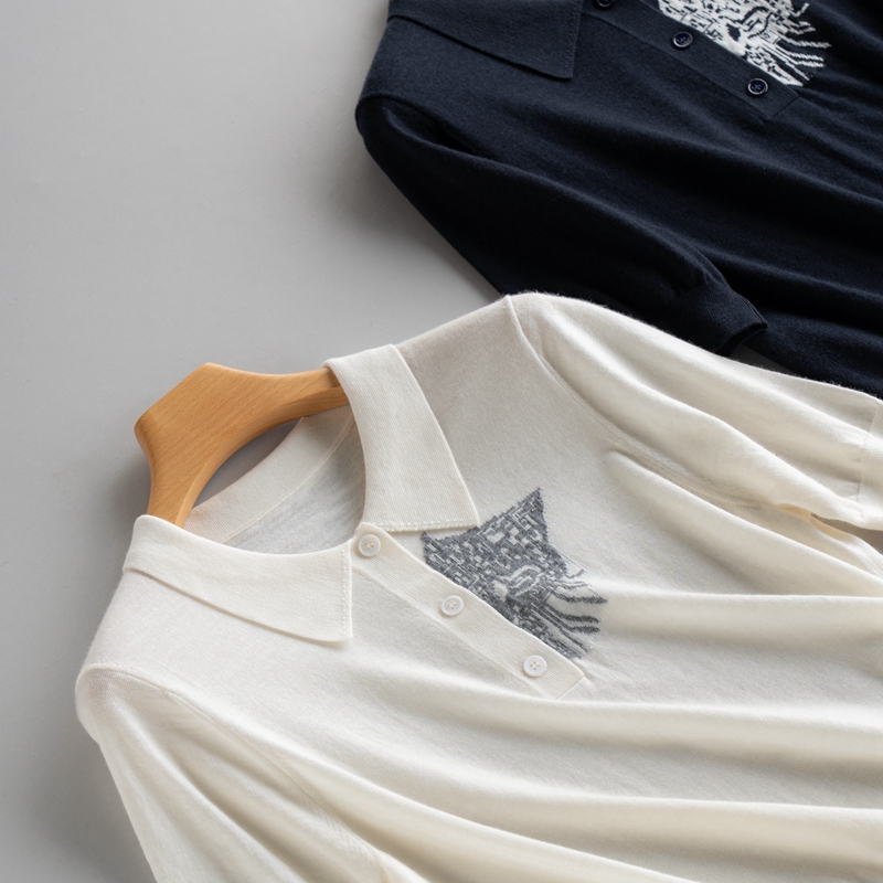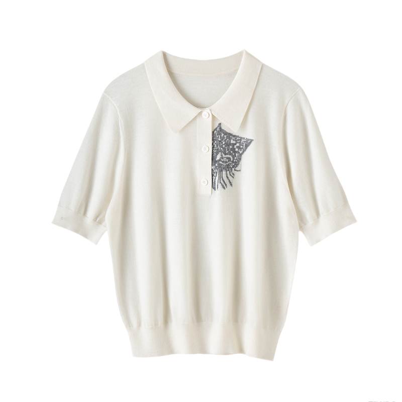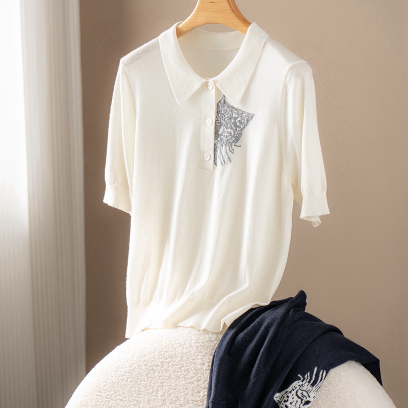 精纺薄款100%纯山羊绒衫女嵌花衬衣领针织衫宽松短袖套头轻奢高端