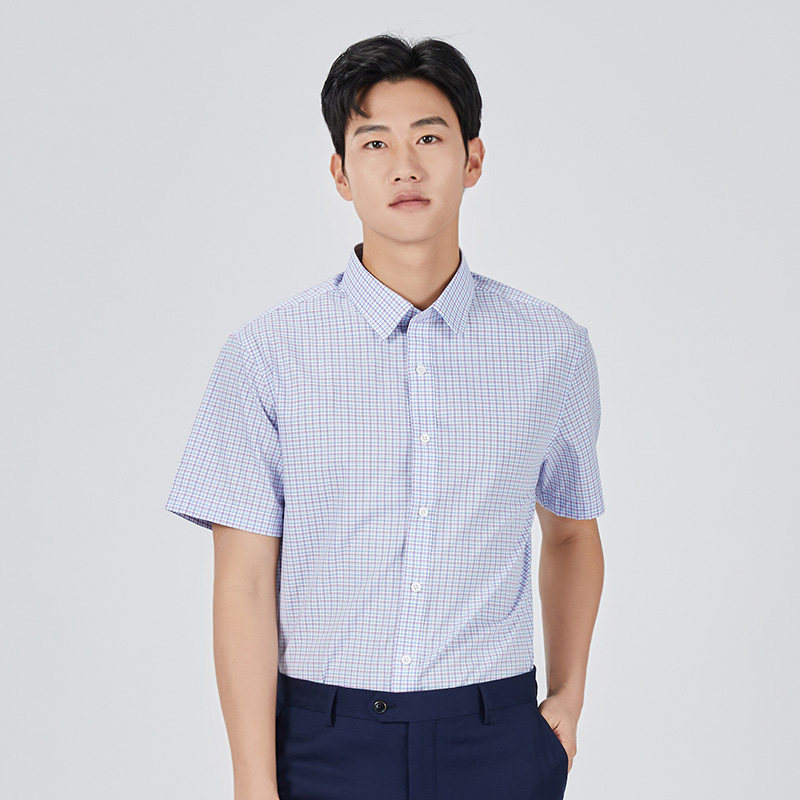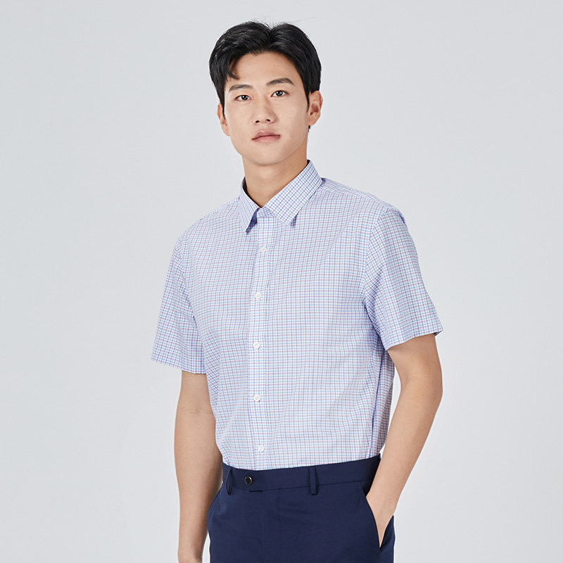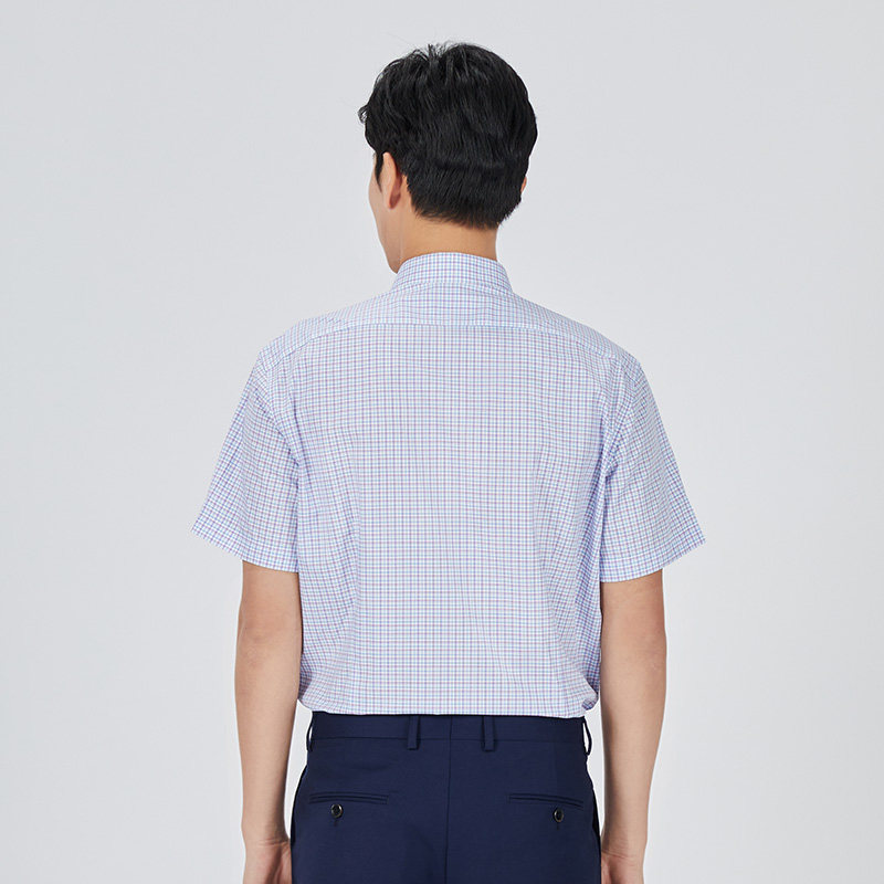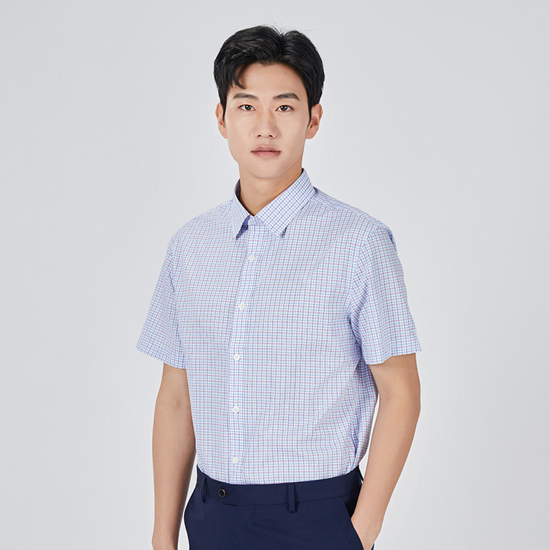 乔治白夏季薄款男士短袖衬衫尖领蓝红格子衬衣柔软轻便休闲修身上
