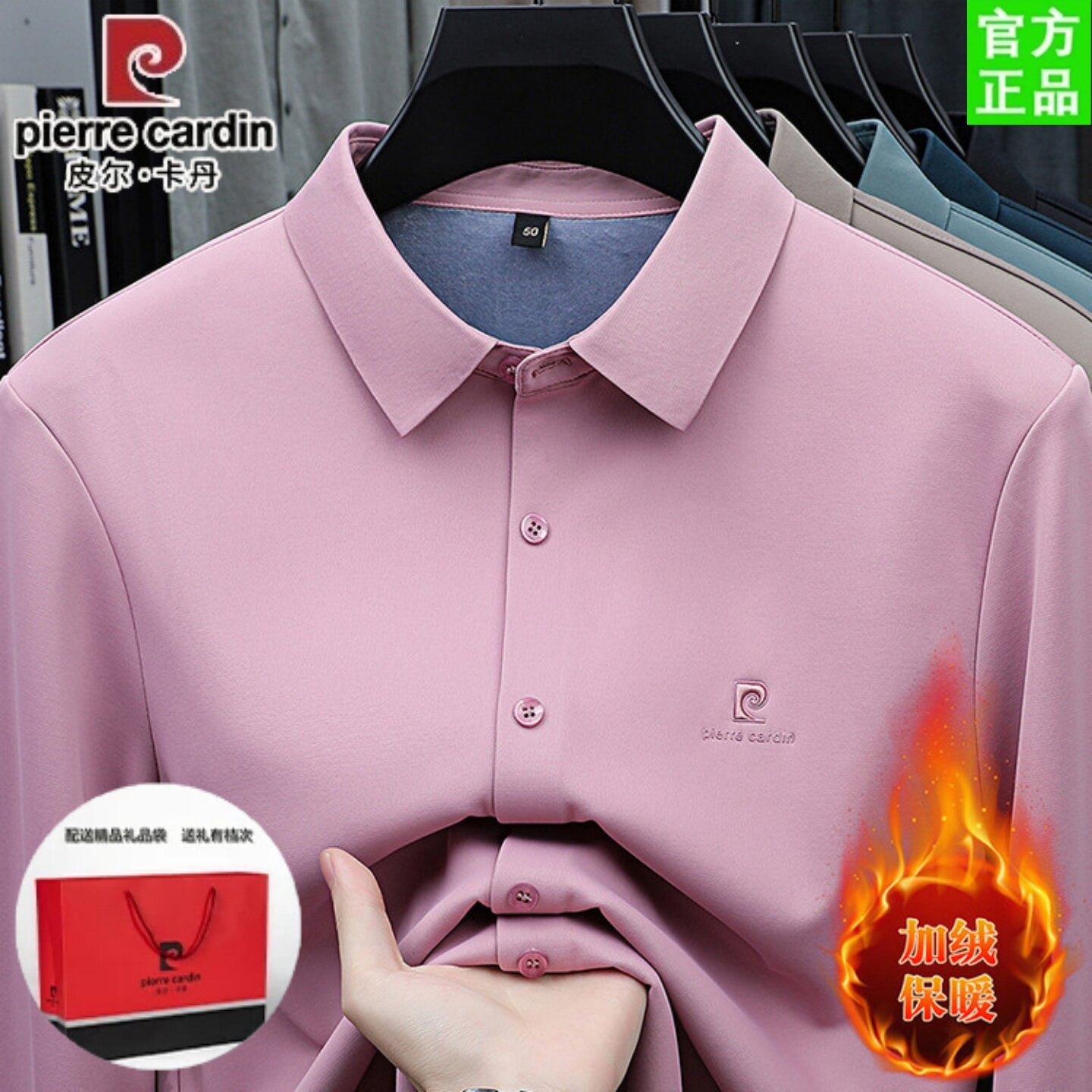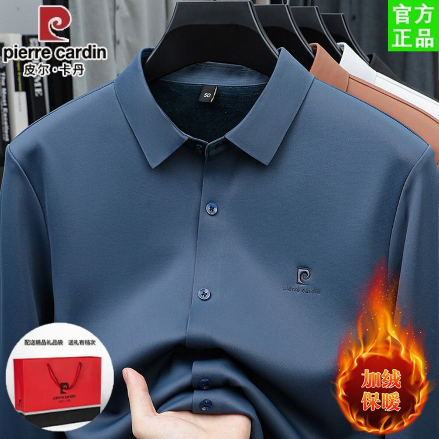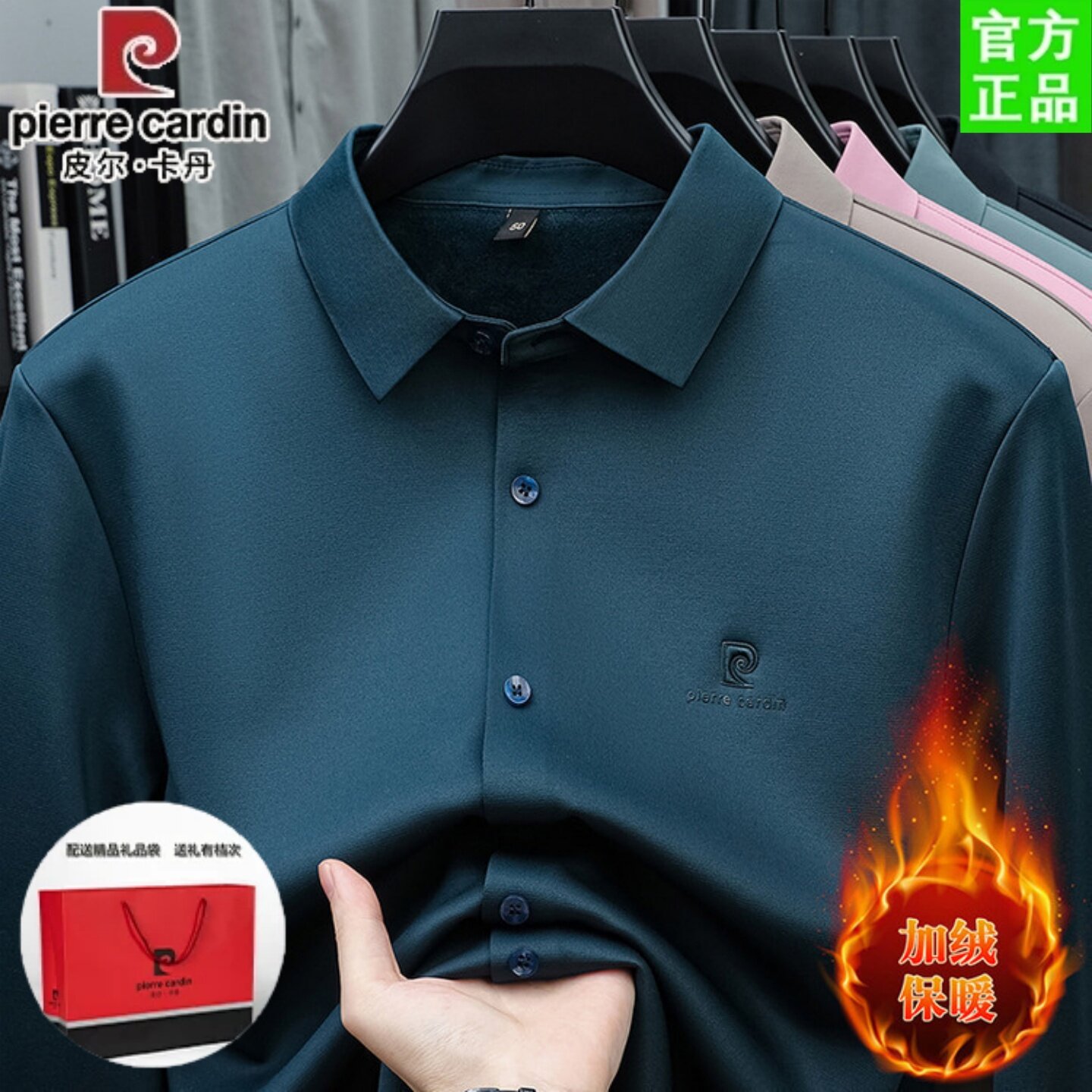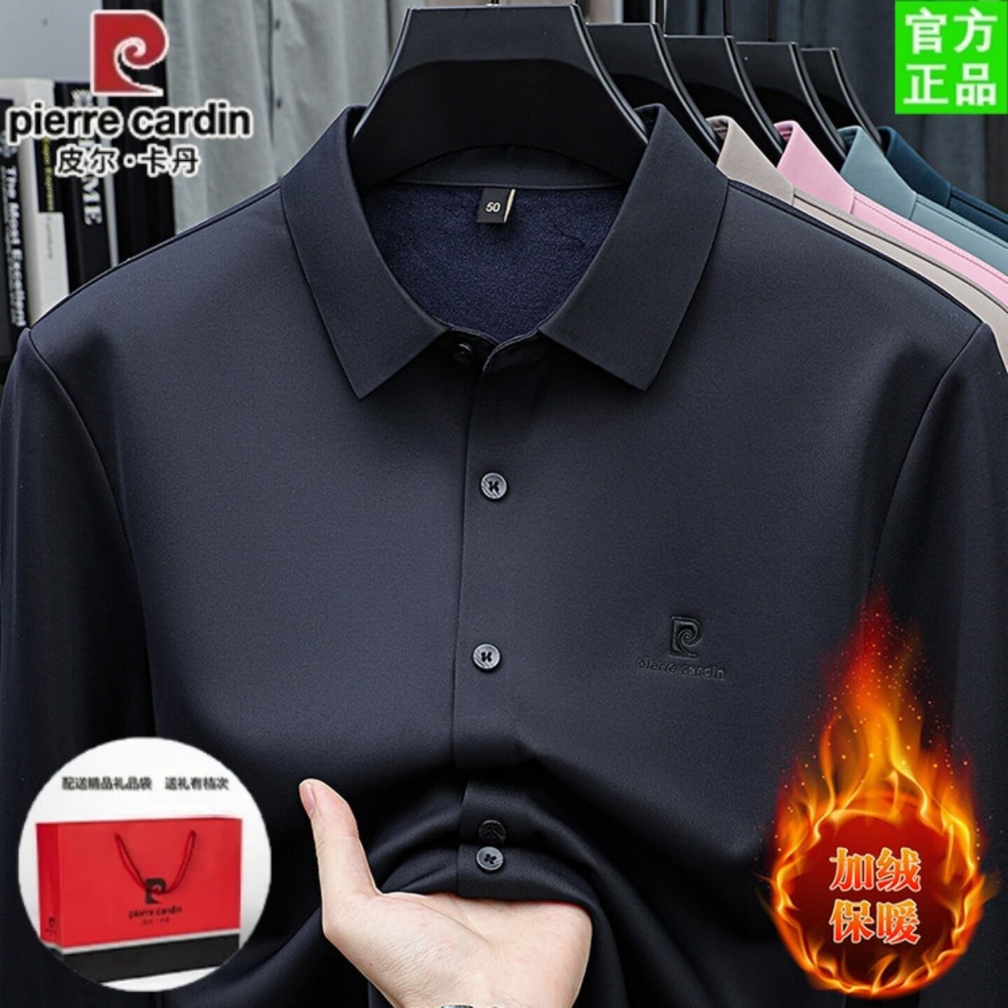 皮尔卡丹秋冬新款男士桑蚕丝加绒衬衫新款商务休闲翻领保暖卫衣