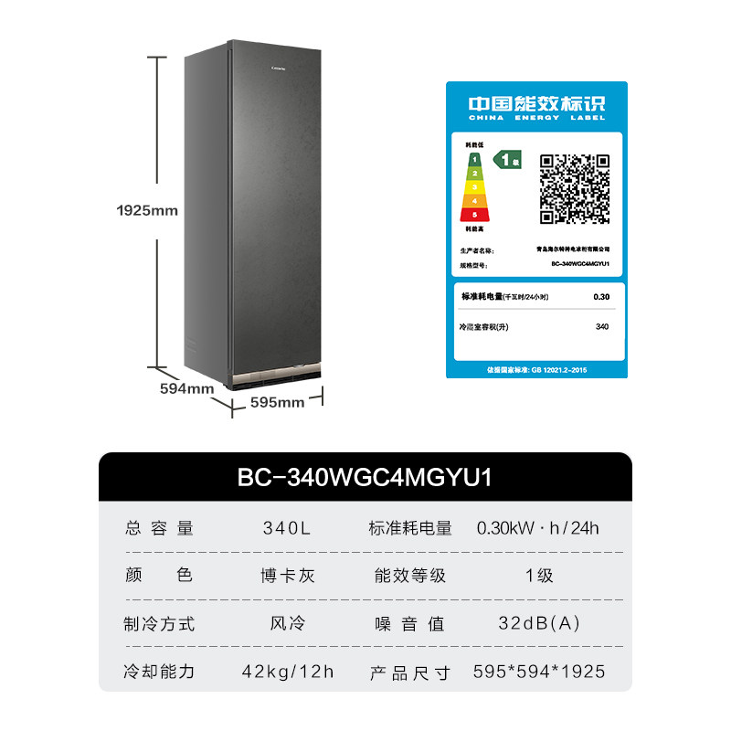 卡萨帝340L平嵌超薄大容量变频风冷家用一级节能智能冷柜冷藏柜