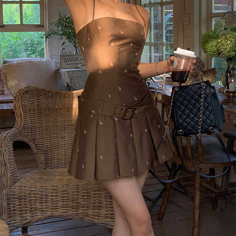 【禧爱】樱花拿铁碎花百褶吊带连衣裙女春装高级感辣妹显瘦短裙