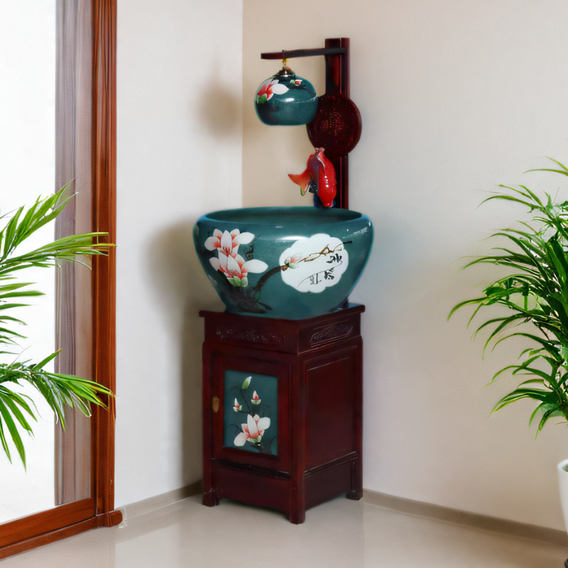 新款景德镇观赏风水牡丹陶瓷鱼缸循环流水摆件带柜子造景家用客厅
