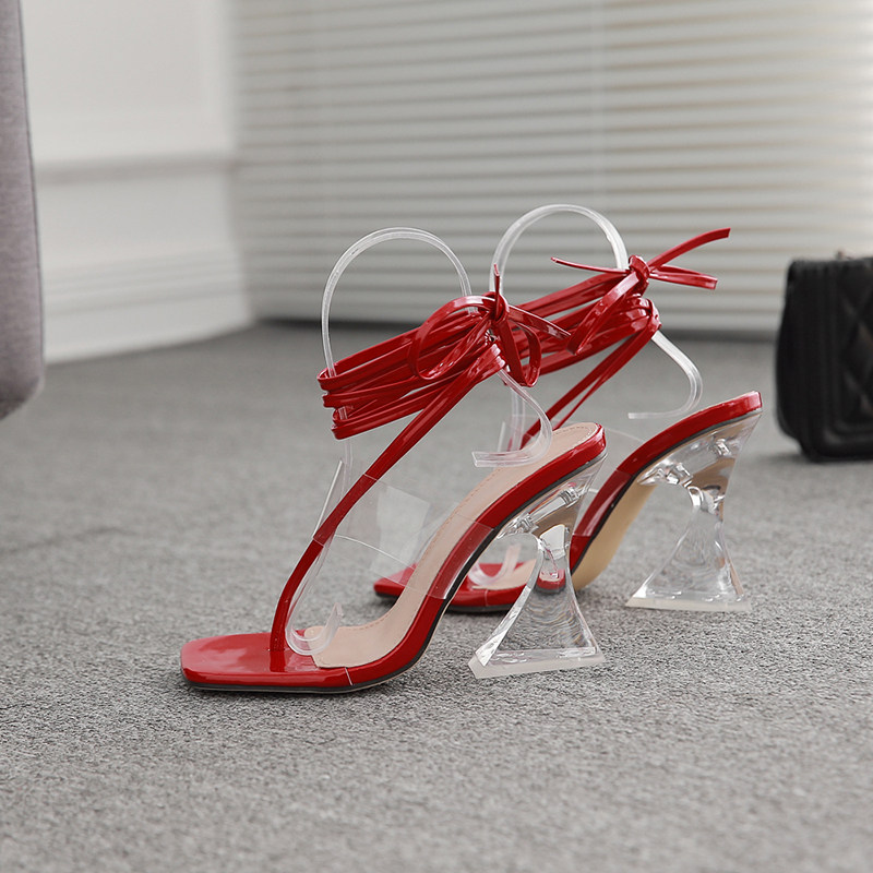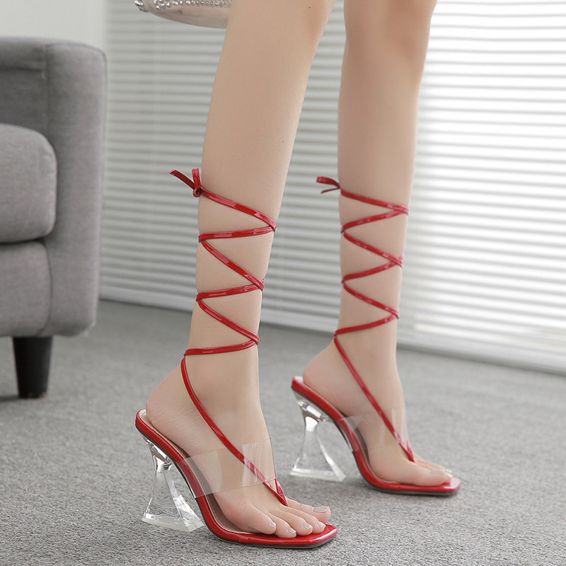 断码清仓特价鞋性感大码时装性感水晶透明粗高跟女士夹趾绑带凉鞋