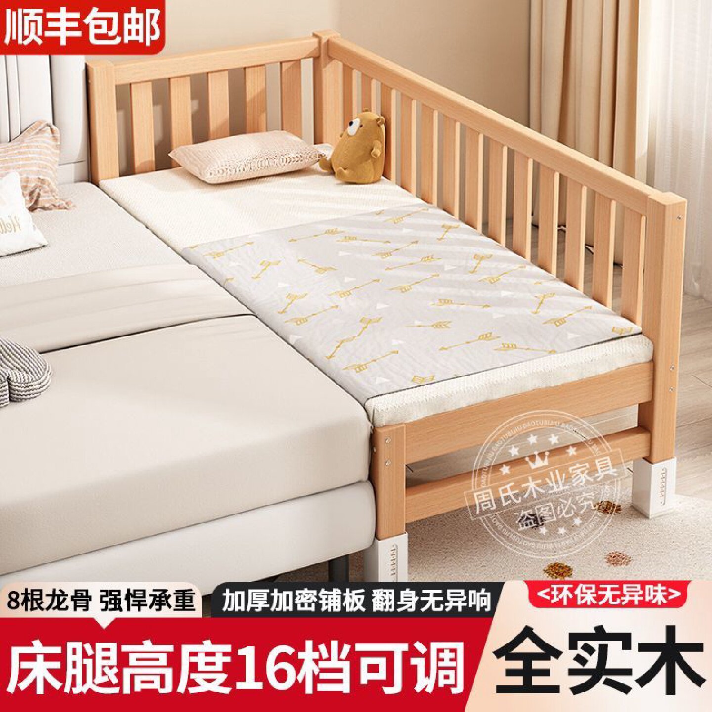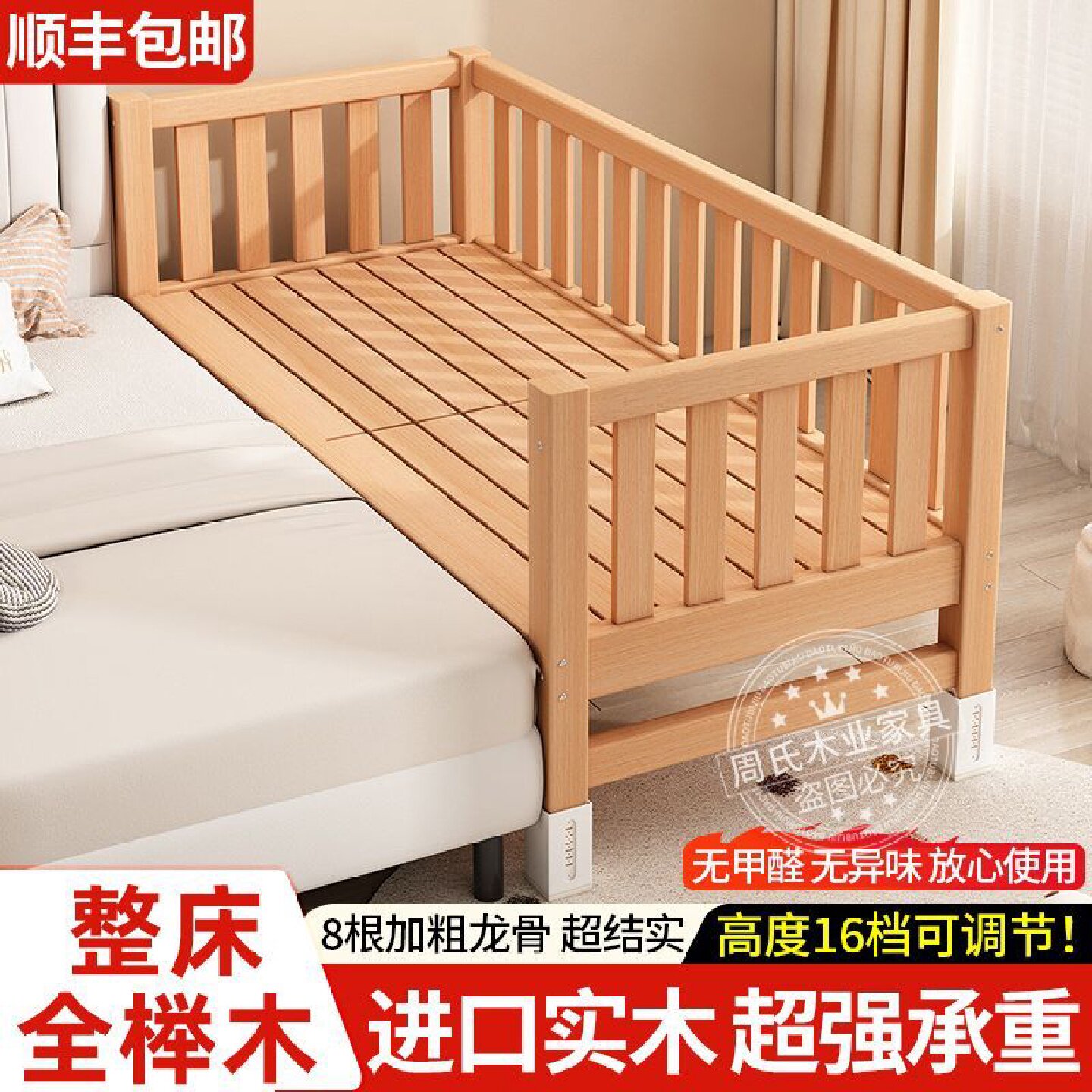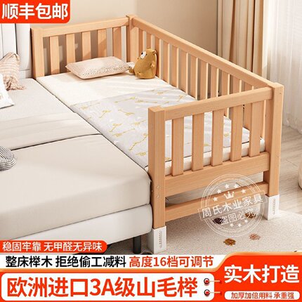 全榉木拼接床男孩女孩婴儿小床加宽大床侧边床可调节带护栏儿童床