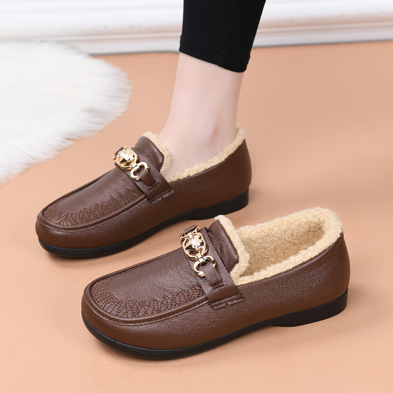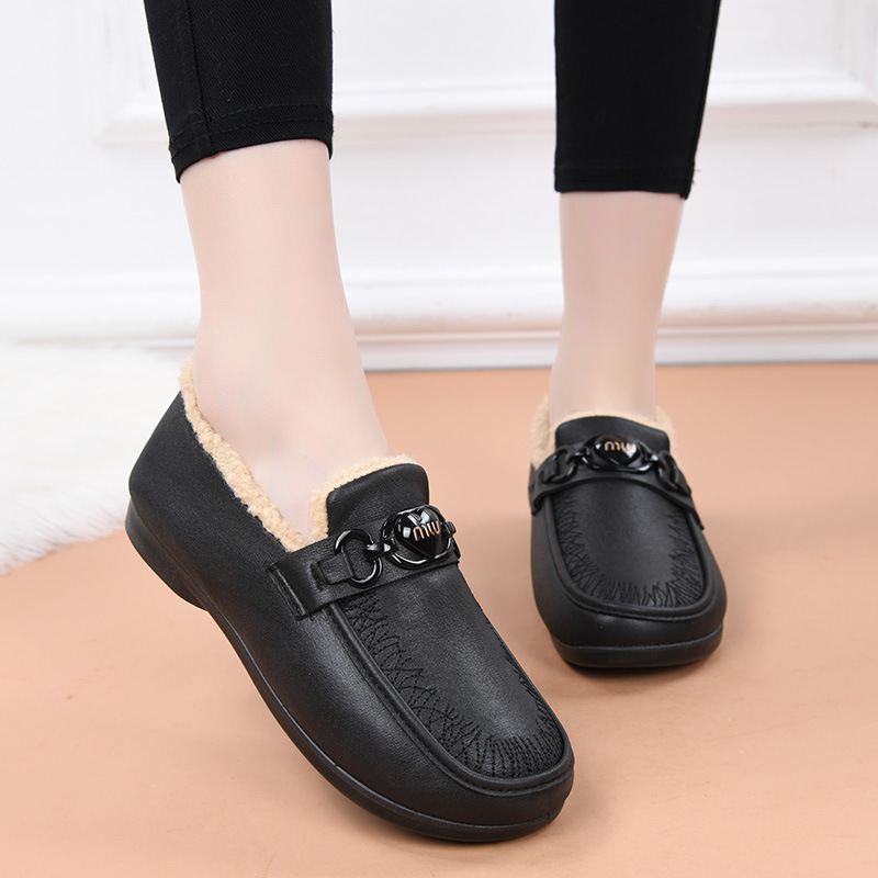 皮面加绒妈妈鞋冬季防水棉鞋女软底舒适中老年一脚蹬加绒保暖棉靴