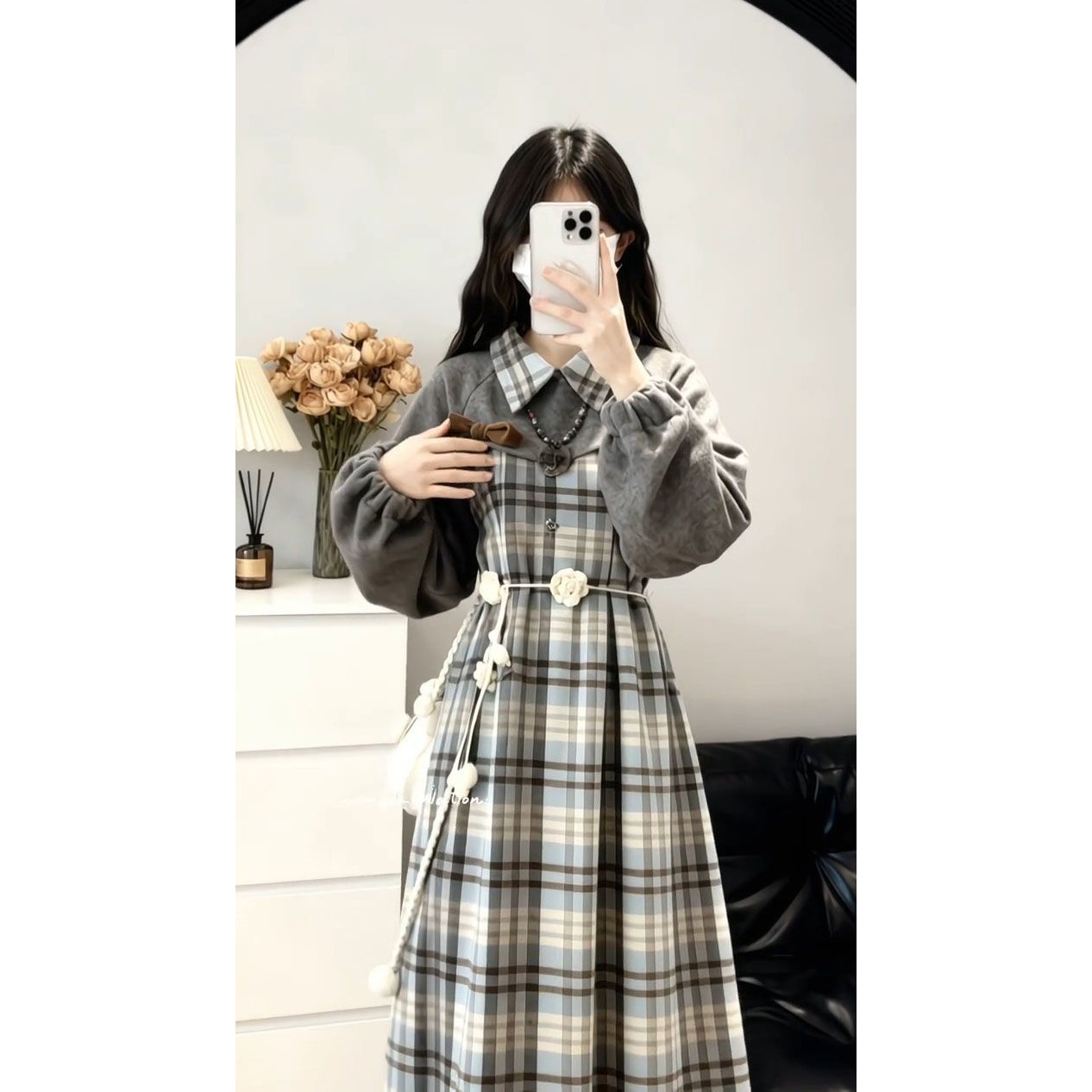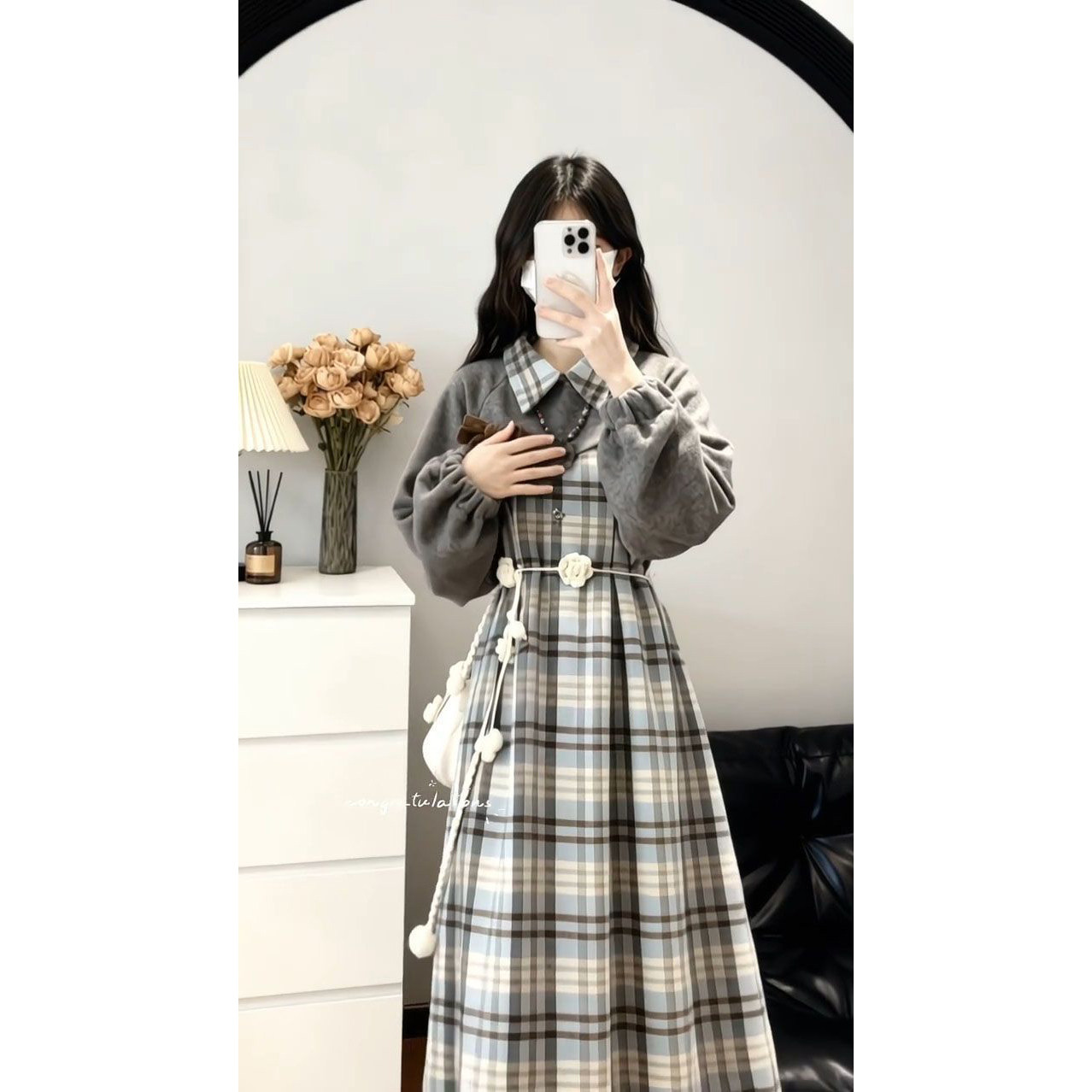 森系ins温柔穿搭POLO领毛呢格纹背心连衣裙+搭配灰色短款外套套装